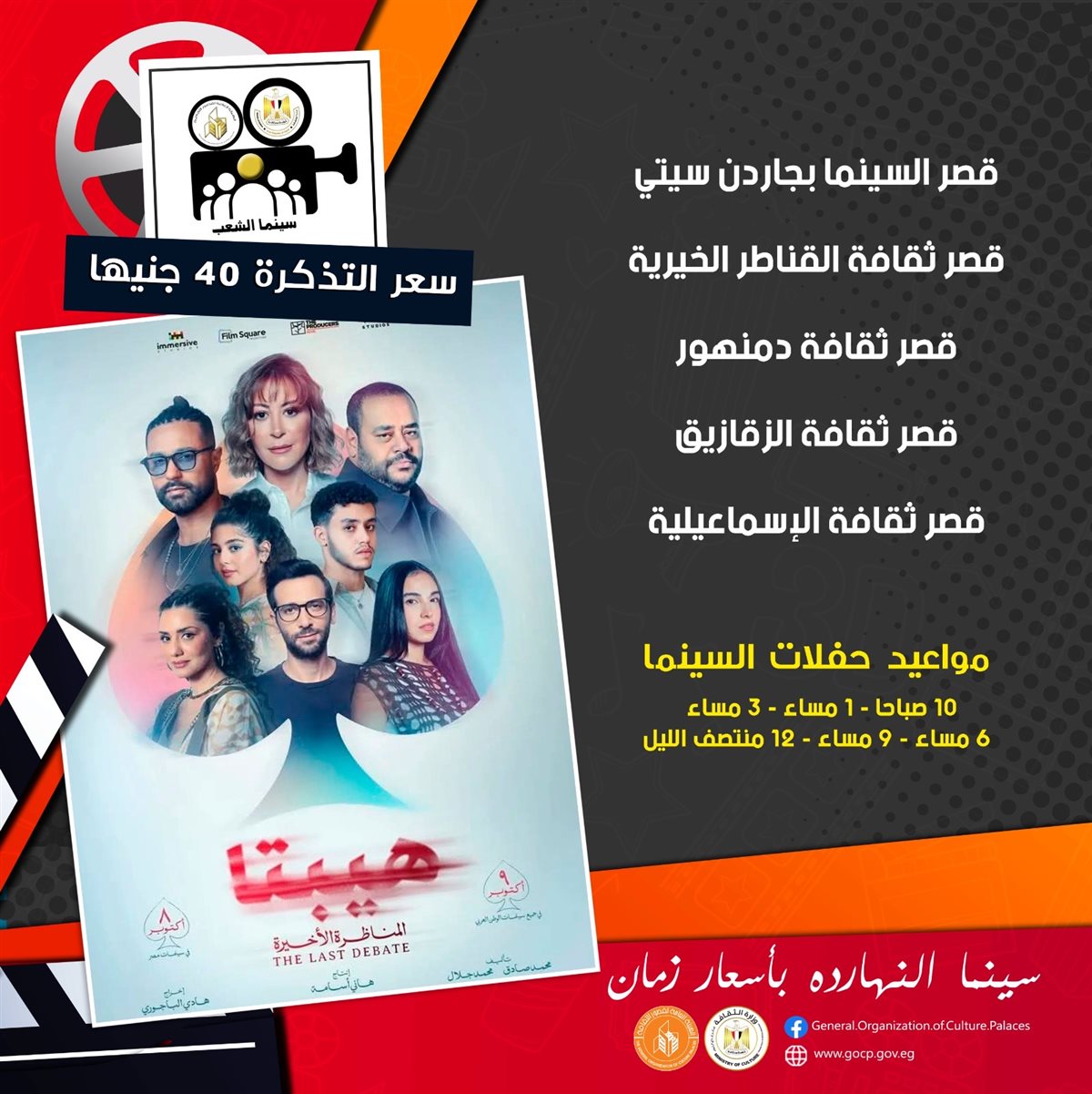 تعرض الهيئة العامة لقصور الثقافة، برئاسة اللواء خالد اللبان، اعتبارا من اليوم الأربعاء، الفيلم السينمائي "هيبتا.. المناظرة الأخيرة"، بعدد من مواقعها الثقافية بالقاهرة والمحافظات، ضمن مشروع "سينما الشعب"، المقدم في إطار برامج وزارة الثقافة.