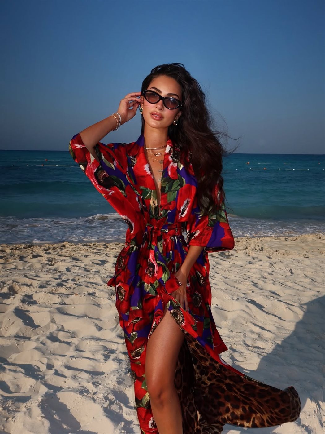 كما خطفت نور الغندور الأنظار مؤخرًا بإطلالة صيفية مفعمة بالألوان خلال جلسة تصوير على أحد الشواطئ، ارتدت فيها فستان كيمونو واسع مزينًا بنقشات ورود كبيرة باللونين الأحمر والأخضر على خلفية زرقاء ملكية، ما منحها حضورًا لافتًا يناسب أجواء الصيف.
