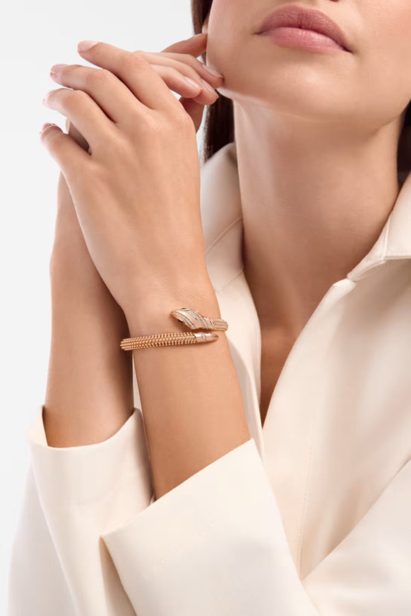 تغوص بولغري في أسطورة الأفعى من جديد مع سوار Serpenti المصنوع من الذهب الوردي عيار 18 قيراطاً، والمرصّع بالألماس pavé مع لمسات من العقيق الأسود على العيون.