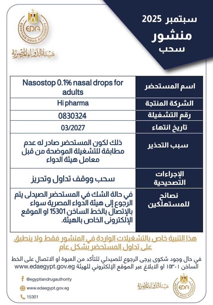 أعلنت هيئة الدواء المصرية عن سحب وتشغيل وإيقاف تداول تشغيلة من مستحضر Nasostop 0.1% nasal drops for adults، تحمل رقم 0830324، وتاريخ انتهاء 03/2027.