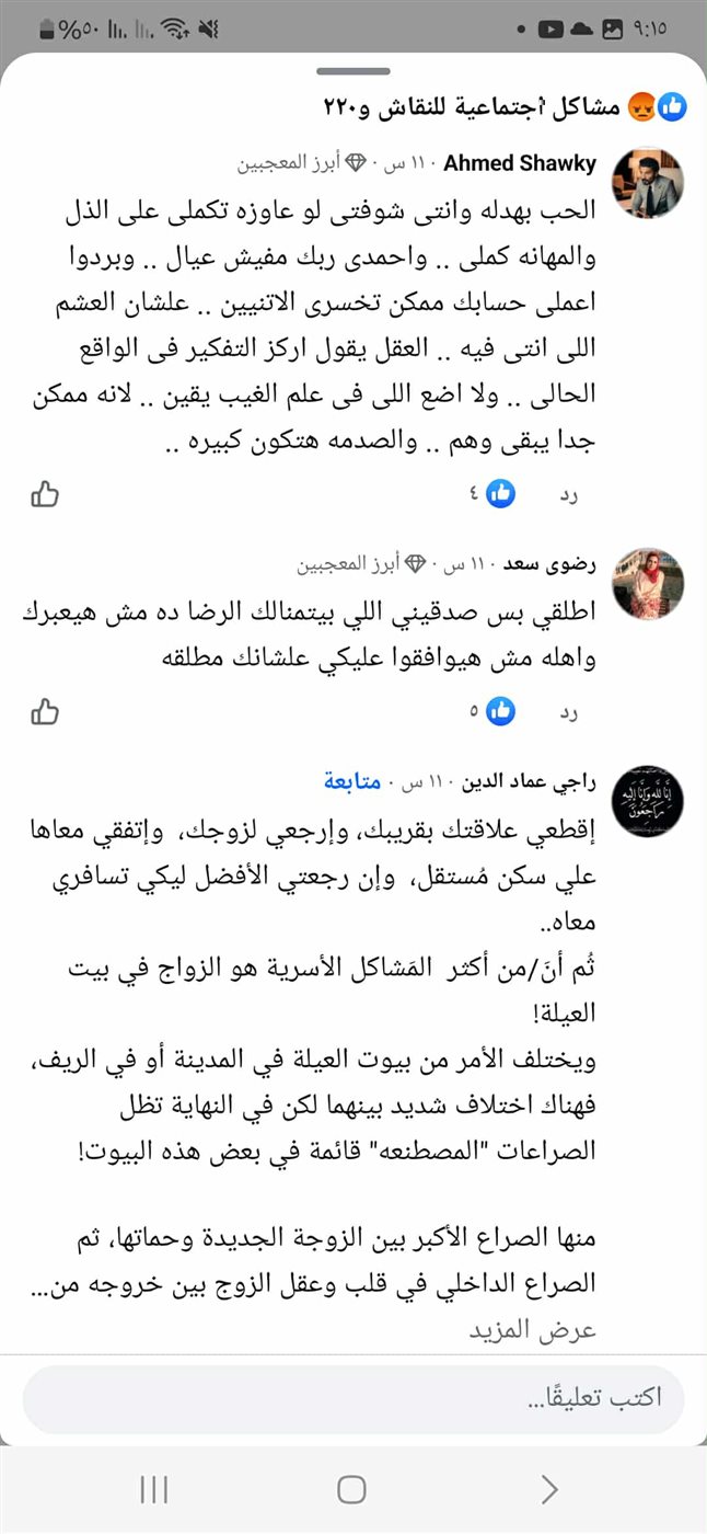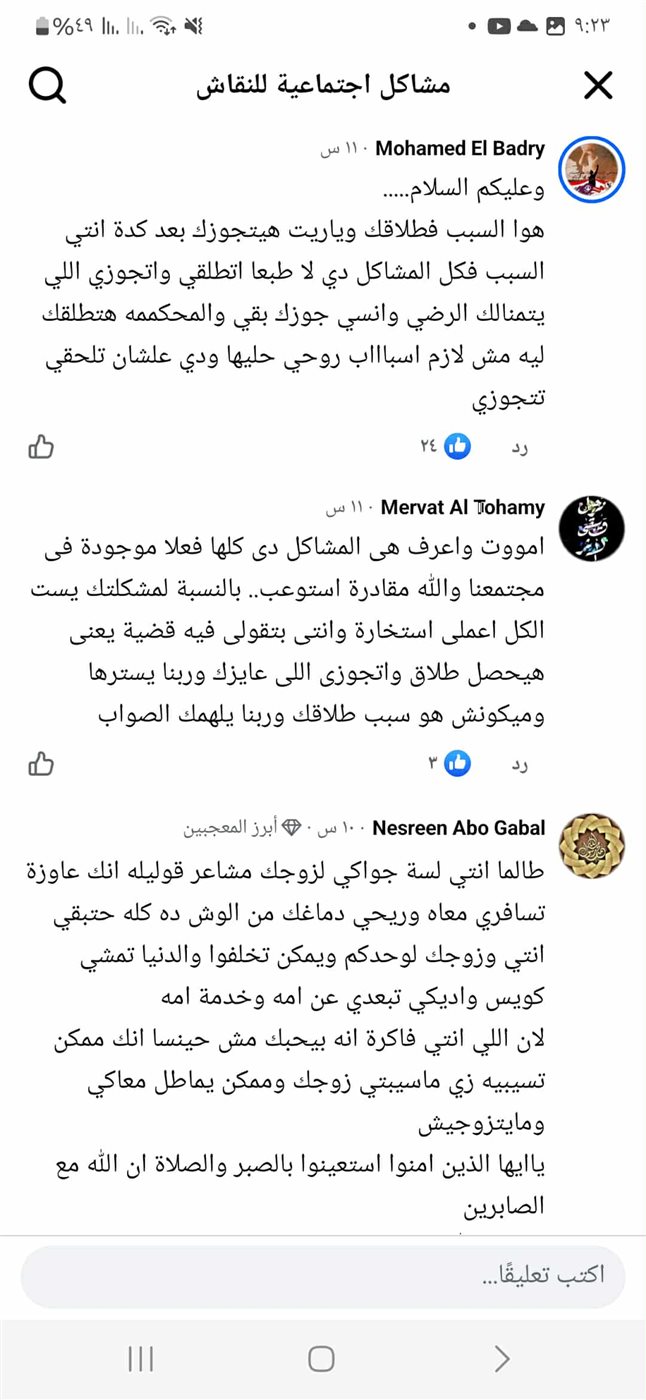 نصحتها "ن.ا" بأن تقوم بحل مشاكلها أولًا وبعدها تُفكر في العريس والذي لا تجد له مبرر في حديثه معها عن زواج وهي لا زالت على ذمة رجل أخر.