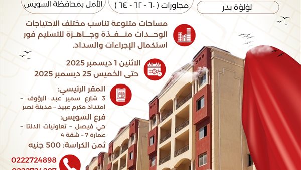 وأضافت الهيئة أن الوحدات منفذة وجاهزة للتسليم فور الانتهاء من الإجراءات والسداد، ويمكن معرفة كافة الشروط والمواصفات والمبالغ المالية من خلال الحصول على كراسة الشروط والمواصفات اعتباراً من يوم الاثنين الموافق 1/12/2025، وحتى يوم الخميس الموافق 25/12/2025 ، وذلك بمقر الهيئة الرئيسي بالعنوان : 3 ش سمير عبد الرؤوف - امتداد مكرم عبيد - مدينة نصر أو بمقر فرع الهيئة بمحافظة السويس بالعنوان حي فيصل - تعاونيات الدلتا - عمارة ٧ – شقة 4.