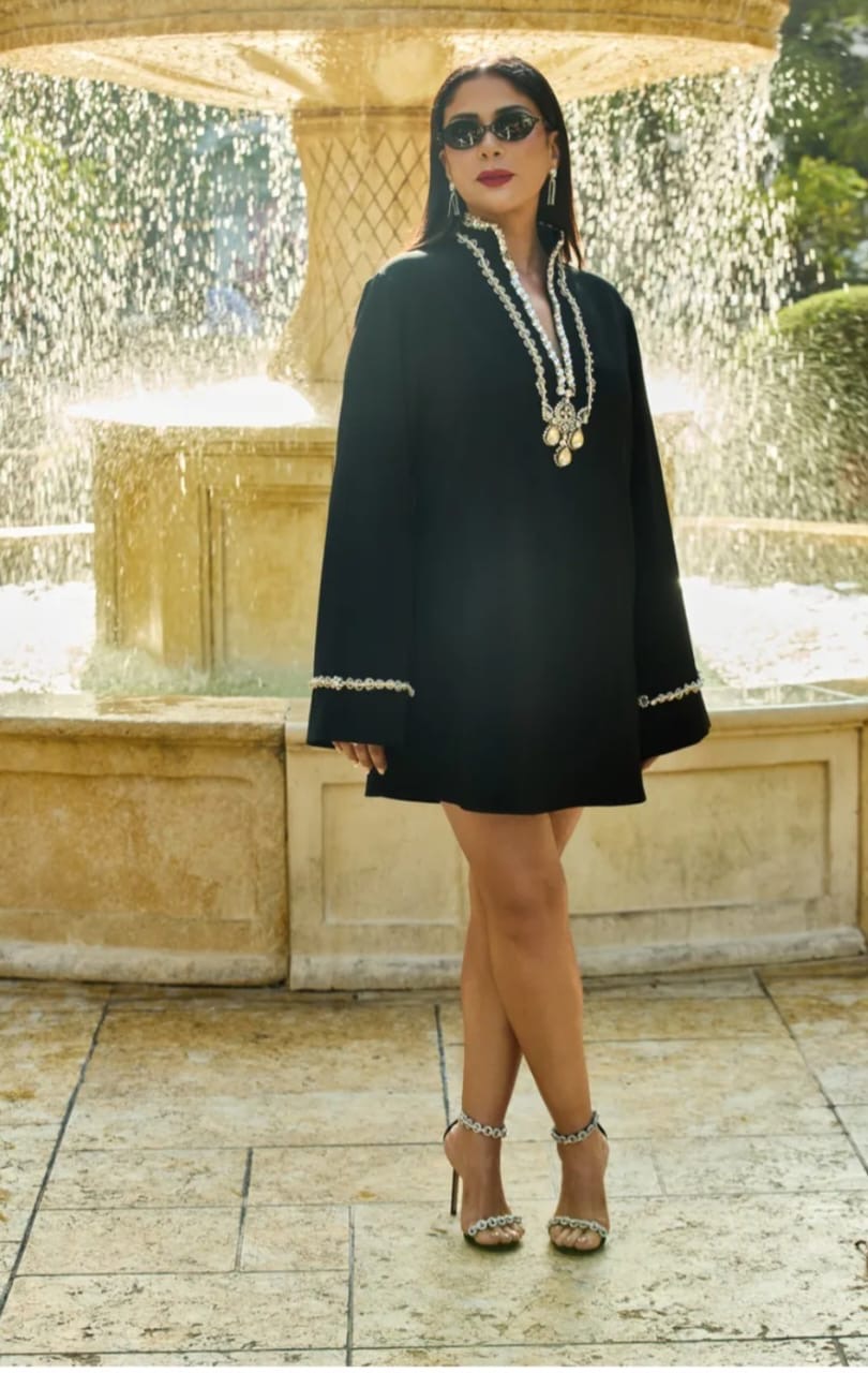 فيما تألقت الممثلة بفستان أسود قصير من تصميم زهير مراد، ومجوهرات فاخرة من كارتييه، في تنسيق أنيق أعدّه الستايلست سيدريك حداد.