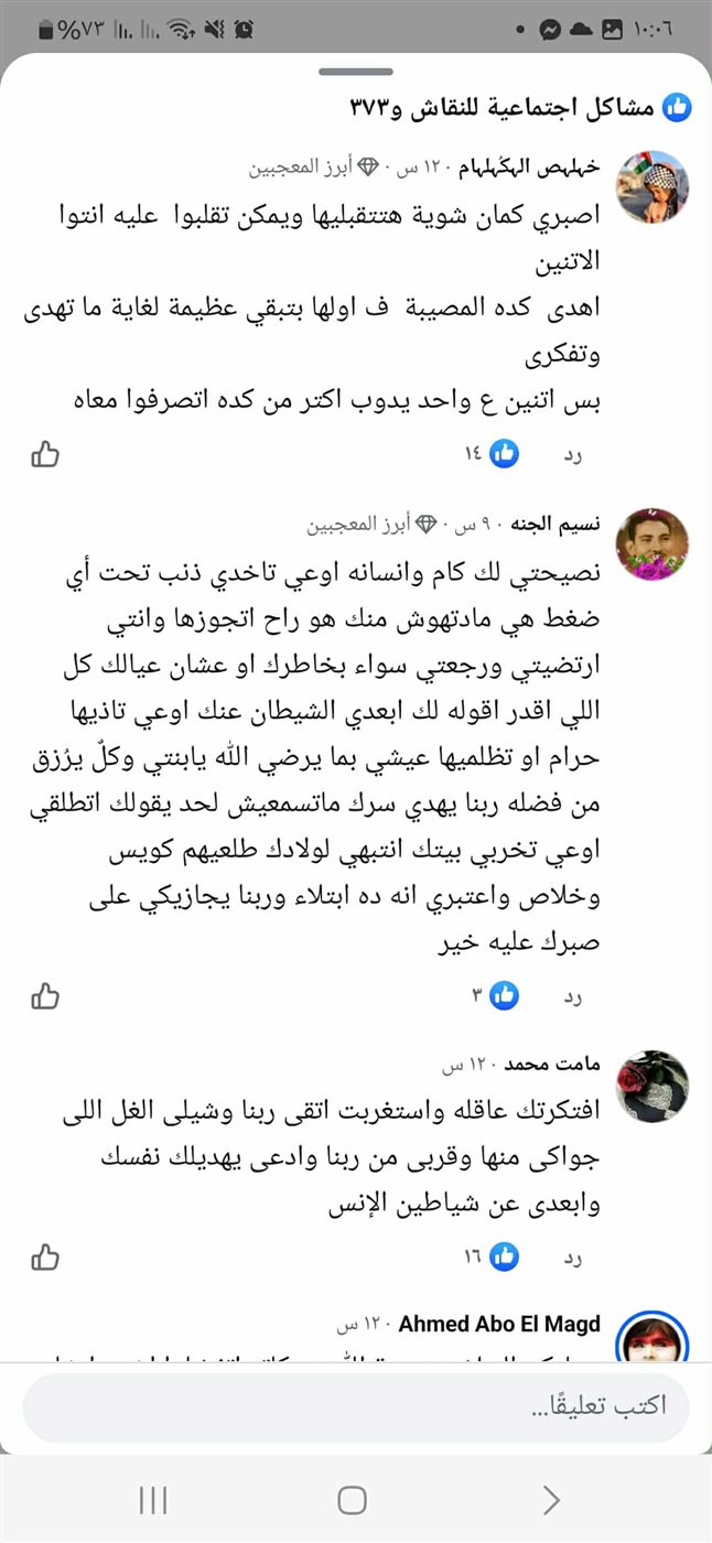 استهلت "ذ.ا" تعليقها بقوله تعالى "ولا يحيق المكر السئ إلا بأهله" وأن الأفضل لها أن تفكر بحياتها لا بأذية المرأة لآخرى وبما أنها قد عادت لبيتها فعليها بالرضا بالوضع الحالي ولا تسأل زوجها طلاق للأخرى.