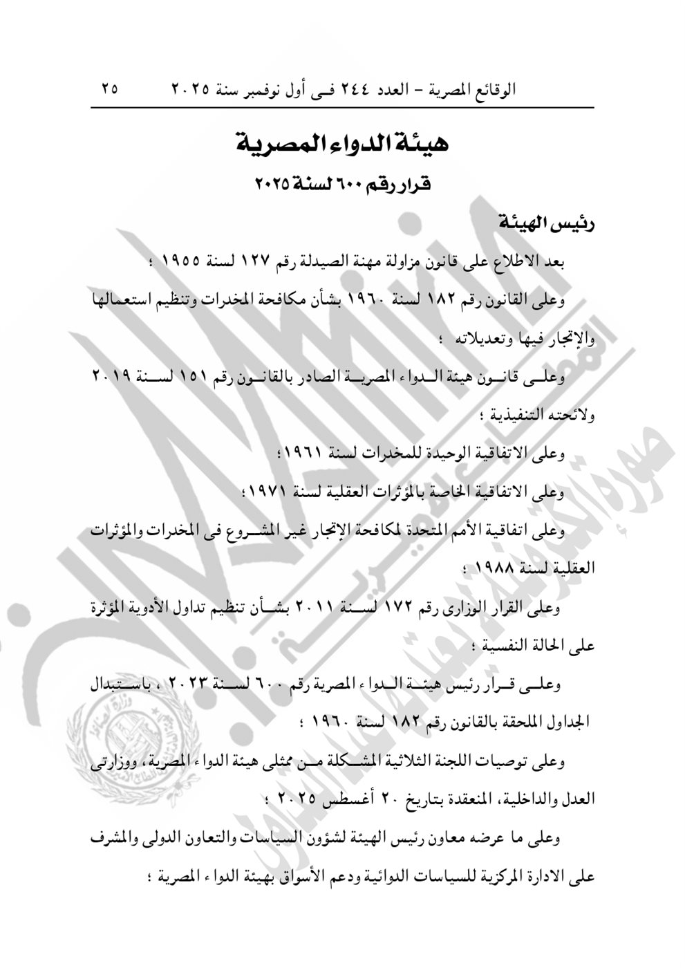 نشرت جريدة الوقائع المصرية في عددها رقم 244، الصادر في أول نوفمبر 2025، قرار هيئة الدواء المصرية رقم 600 لسنة 2025، بشأن إلحاق مادة تستخدم في صناعة بعض الأدوية والمواد العطرية في جدول المخدرات.