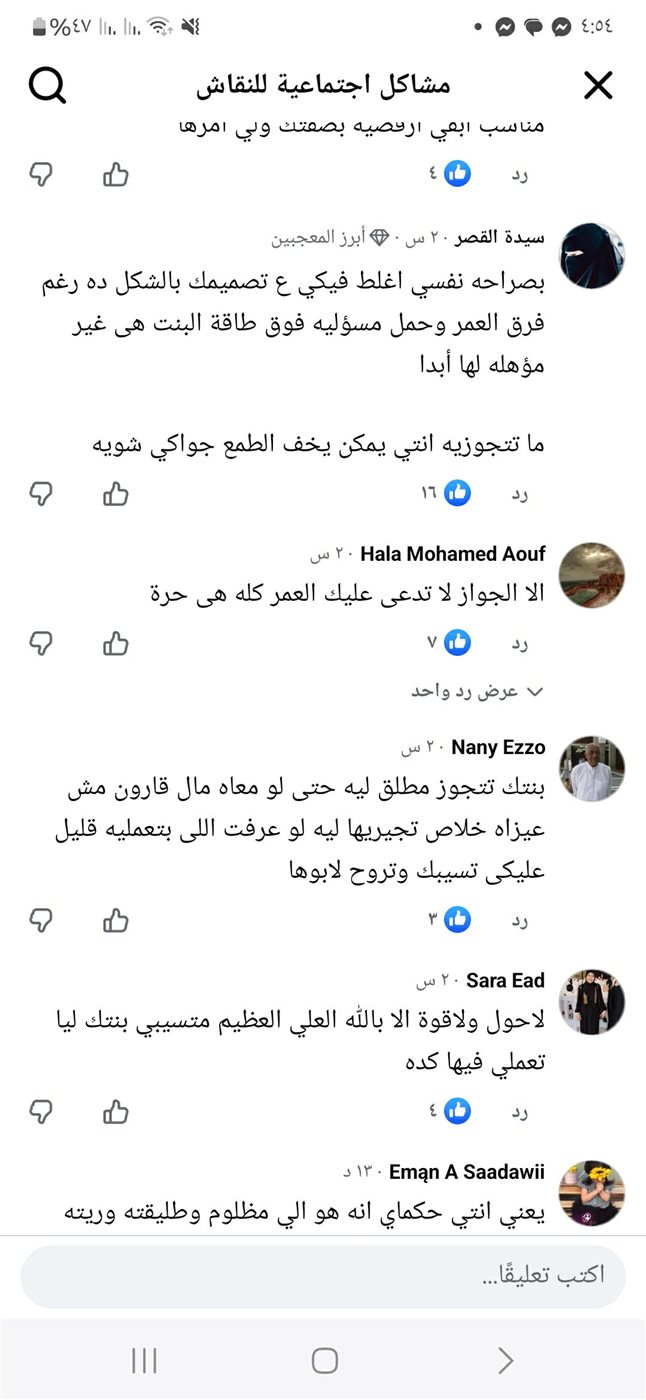 وبسخرية علقت "م.م" "اتجوزيه أنتي طالما عاجبك شكله"، وطلبت منها أن تترك إبنتها تختار من هم في سنها ومناسبين لها، كما تعجبت "م.ع" من طريقة تفكير الأم في اختيارها لرجل مطلق ومعه أبناء لإبنتها.