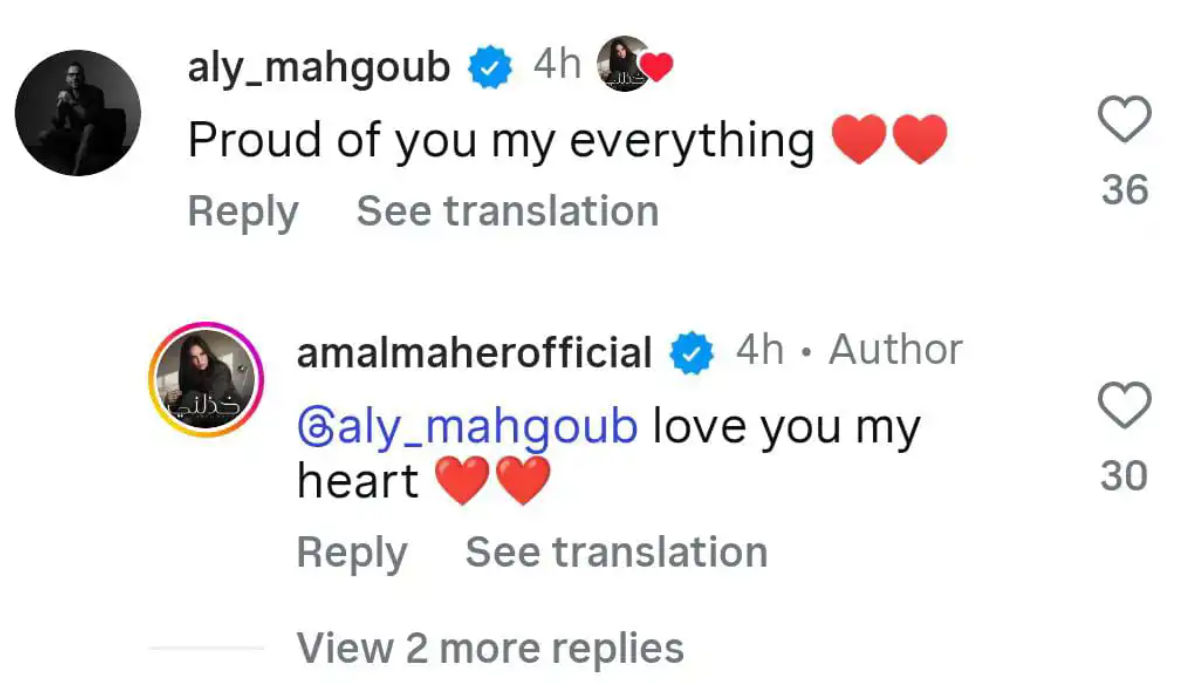 وجاء هذا الإعلان غير المباشر بعدما علّق علي محجوب على أحدث صور آمال ماهر عبر حسابها الرسمي على “إنستجرام” قائلاً: “فخور بكِ يا كل شيء بالنسبة لي”، لترد عليه آمال برسالة رومانسية قصيرة قالت فيها: “أحبك يا قلبي”.