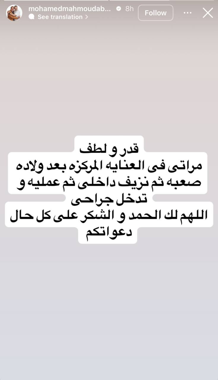 فاجأ الممثل محمد محمود عبد العزيز جمهوره بخبرٍ مؤلمٍ أعلن فيه عن تدهور الحالة الصحية لزوجته، إثر ولادة صعبة أدت إلى نزيف داخلي حاد استدعى تدخلاً جراحياً عاجلاً، لتُنقل بعدها إلى العناية المركزة تحت إشراف فريق طبي متخصص.