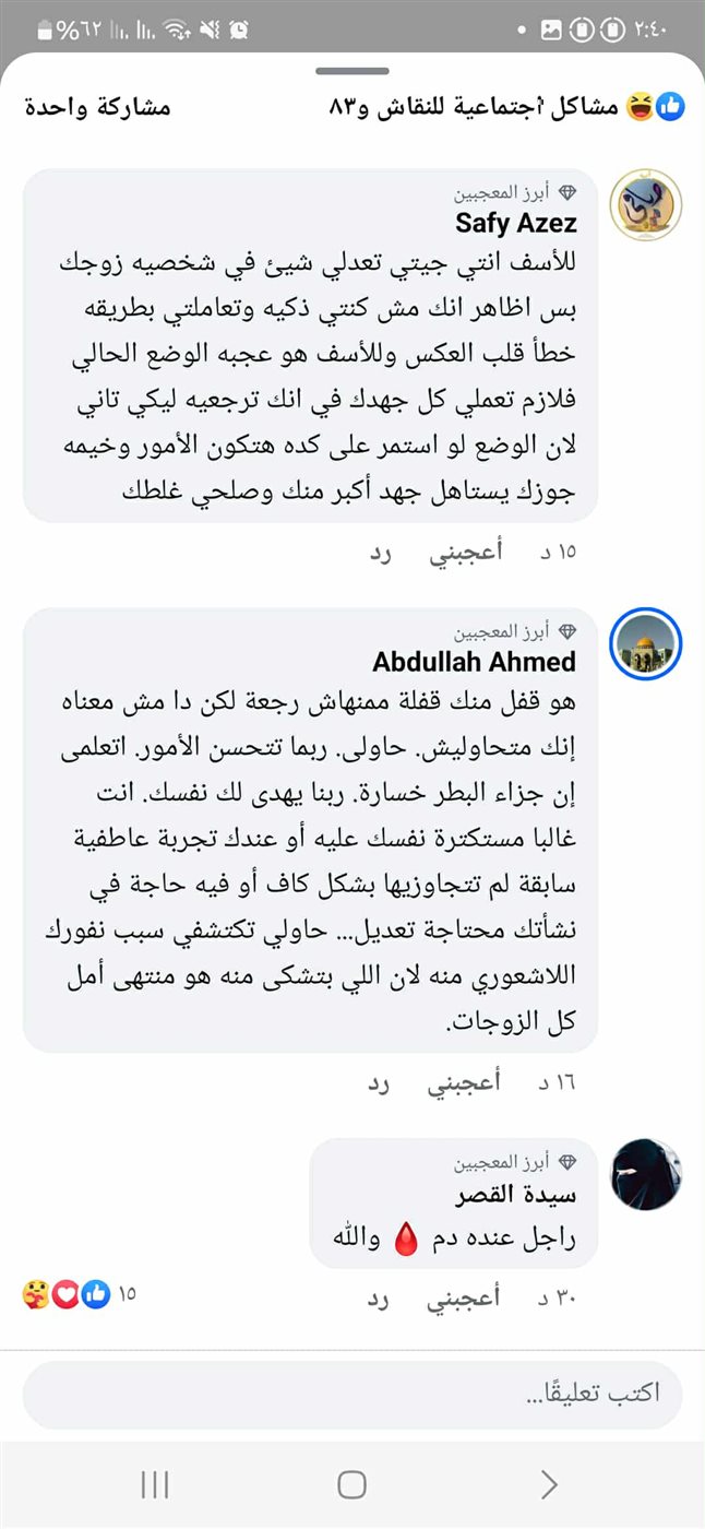 طلبت منها "ذ.ا" ألا تشكو فهي من تسببت في إبداله بتصرفاتها معه حتى صار على هذا النحو، أما" ر.ع" فأكد على أنه وبناء على تلك المشكلة فإن كل محاولة لفهم طبيعة المرأة ستبوء بالفشل، فالمرأة كائن لا يُفهم لأنها وببساطة لا تفهم تصرفاتها وذلك على حد تعبيره، طالبًا من أي رجل أن يتعامل مع المرأة وفق هذه القناعة لكي يتفهم ردود أفعالها.