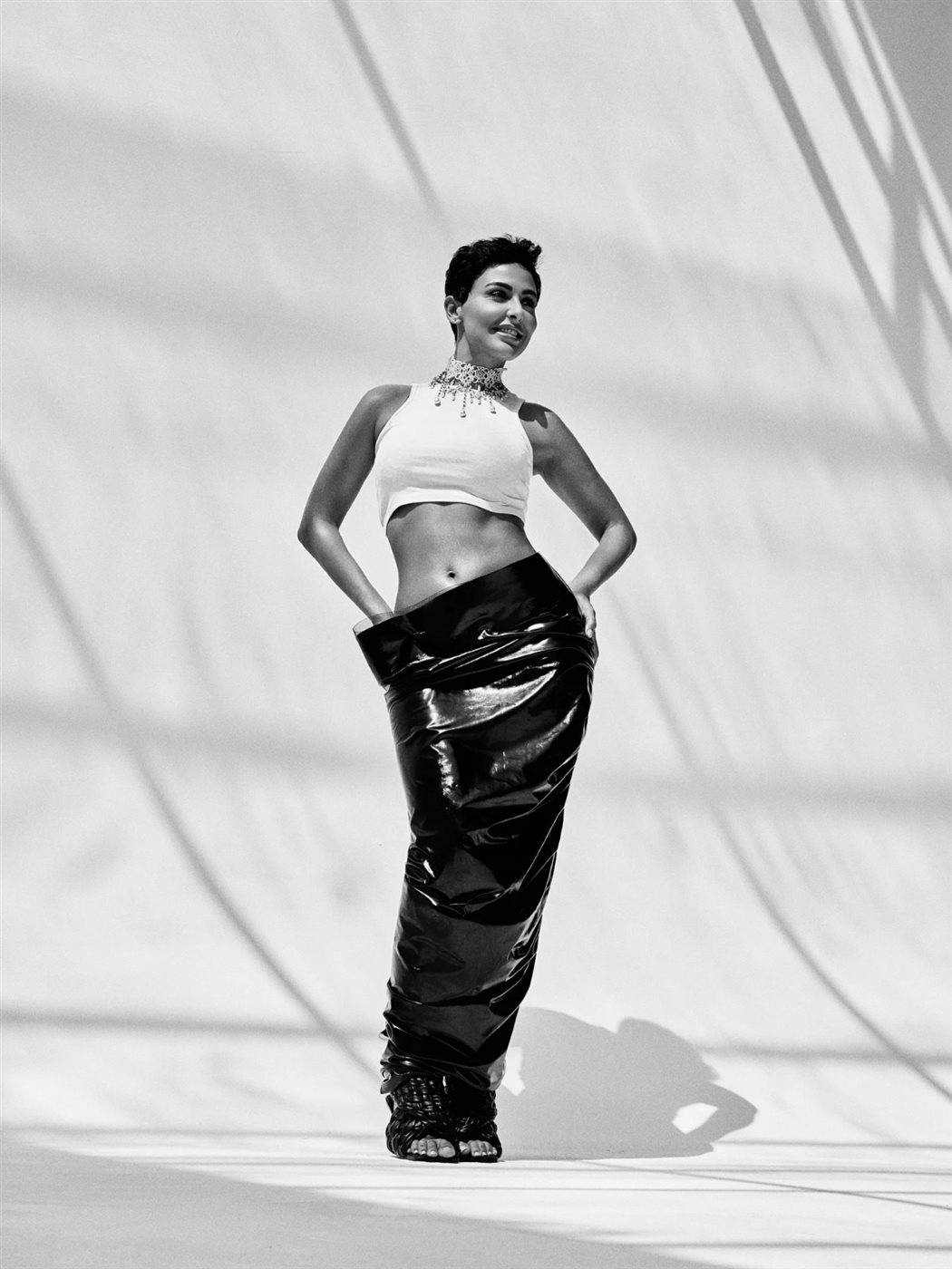 ظهرت ميس حمدان في الصور مرتدية توب أبيض قصير بلا أكمام، نسقته مع بنطلون أسود لامع بتصميم فريد مصنوع من خامة تشبه الجلد الصناعي أو الفينيل، يلتف حول الساقين بطريقة مبتكرة.