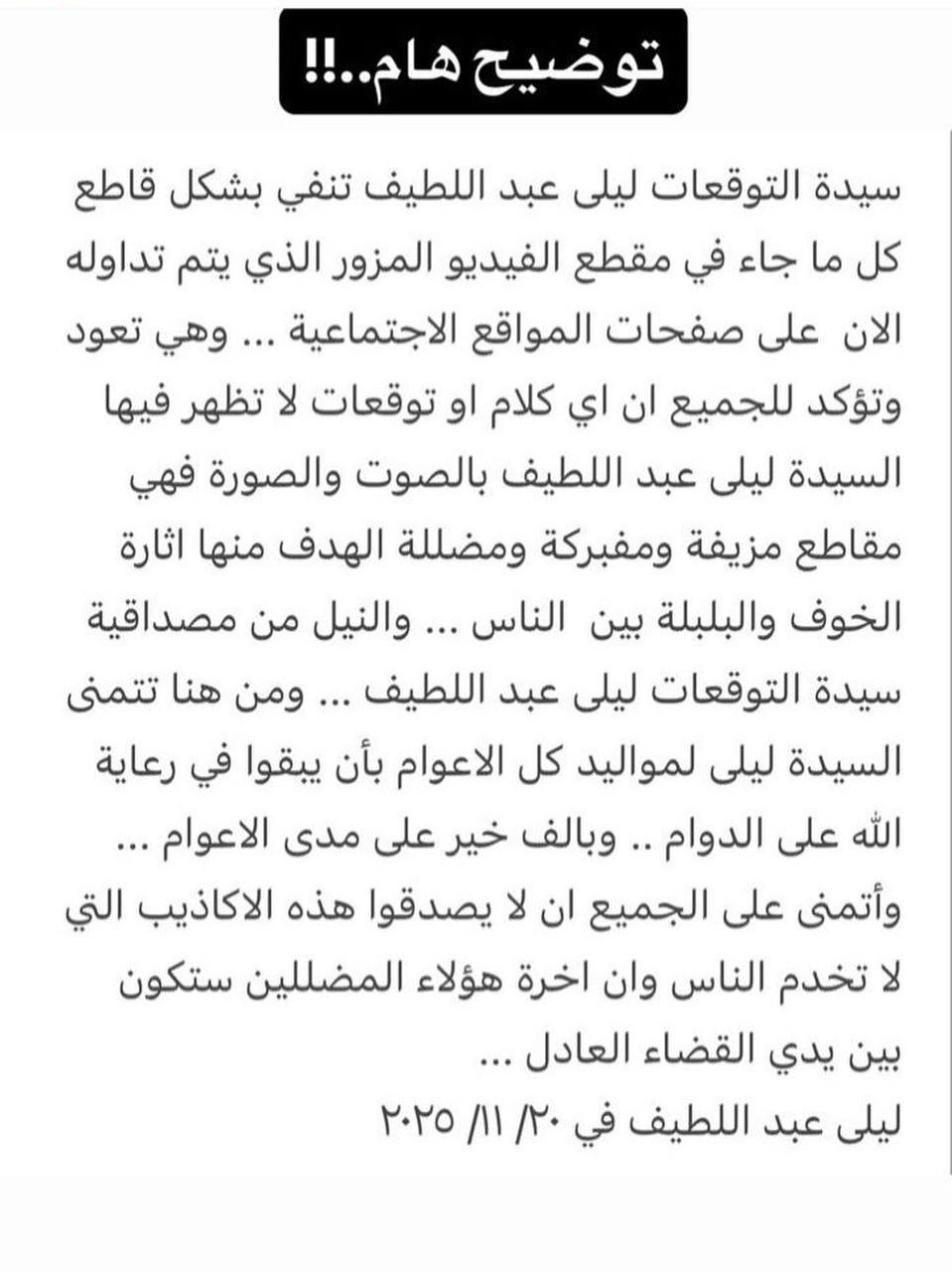وأكدت ليلى عبد اللطيف، عبر بيان رسمي نشرته على حسابها في إنستغرام، أن المقطع المنتشر مفبرك بالكامل ولا يمتّ لها بصلة، مشددة على أن أي محتوى لا تظهر فيه بالصوت والصورة يُعتبر مضللاً ويهدف إلى التشكيك في مصداقيتها.