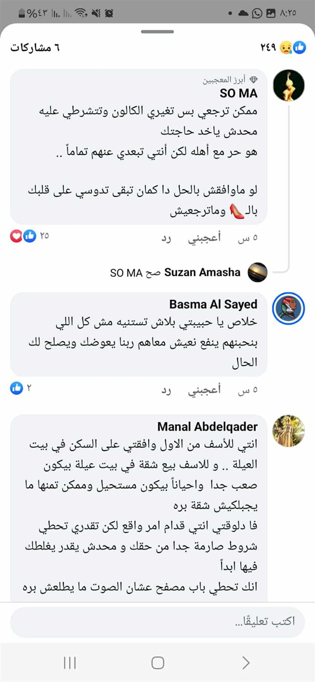 اقترحت عليها "ه.أ" باظن تعود لشقتها ببيت العيلة ولكن تقوم بتغيير كالون باب الشقة وتستقل عنهم وتتركه هو فقط يتعامل معهم، وتضع هي حدود لهم من جديد.