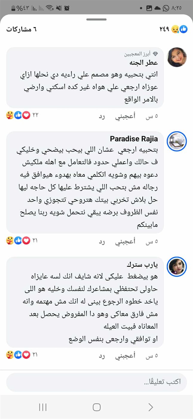 بندم وحنين لطليقها كتبت سيدة مشكلتها على إحدى مواقع التواصل الاتماعي "فيسبوك" حيث قالت أنها لاتزال تحبه ولكن بيت العيلة كان السبب في طلاقها منه، لتوضح أن الأسباب كانت بسبب غيره أخته من جانب وعدم رضا والدته عن أي هدية تأتي لها من زوجة إبنها (صاحبة المنشور).