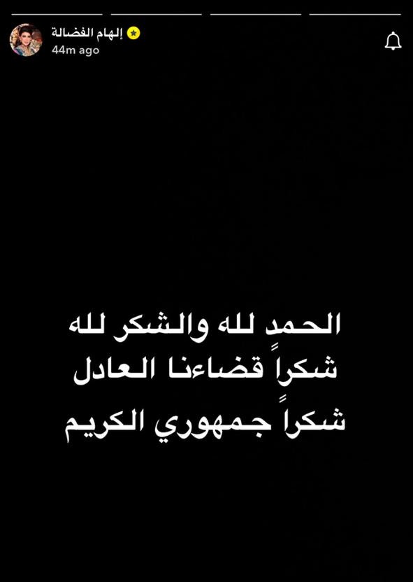 اكتفت الكويتية إلهام الفضالة برسالة موجزة عبّرت فيها عن ارتياحها قائلة: “الحمد لله والشكر لله… شكرًا لقضائنا العادل."