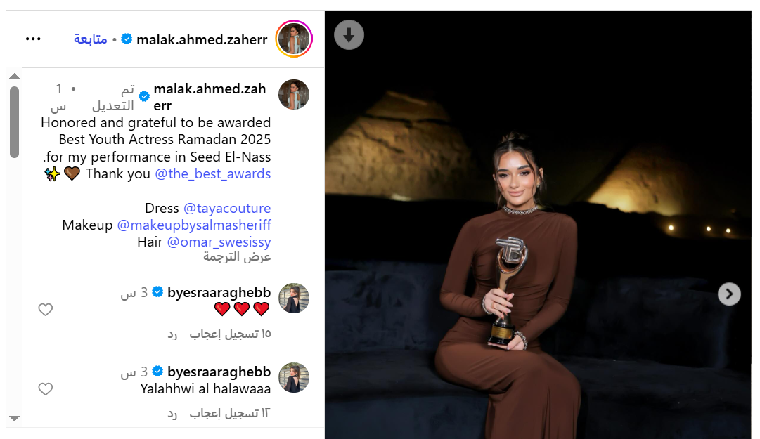 وعبّرت ملك عن سعادتها عبر حسابها الرسمي على إنستغرام، حيث نشرت صورًا من الحفل وكتبت: “يشرفني ويغمرني الامتنان لحصولي على جائزة أفضل ممثلة شابة في رمضان 2025 عن أدائي في مسلسل سيد الناس."
