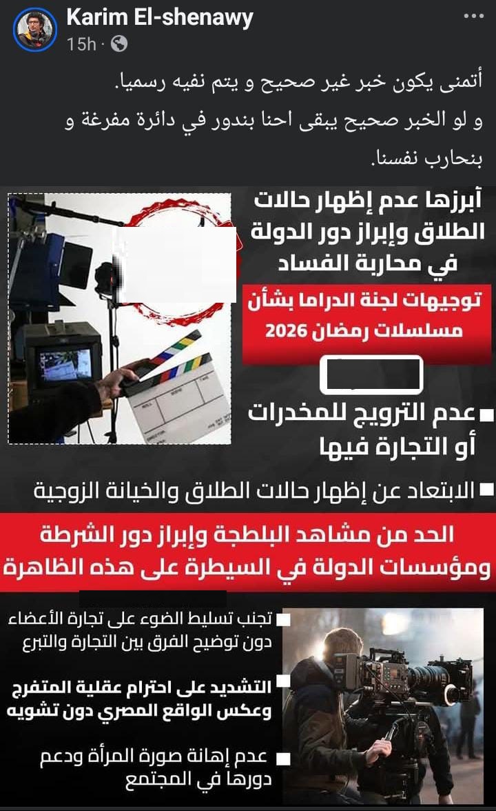 نشر المخرج كريم الشناوي عبر حسابه الشخصي على فيسبوك قائلاً: “أتمنى أن يكون الخبر غير صحيح ويتم نفيه رسمياً، وإذا كان صحيحاً فنحن نواجه حلقة مفرغة ونحارب أنفسنا.”