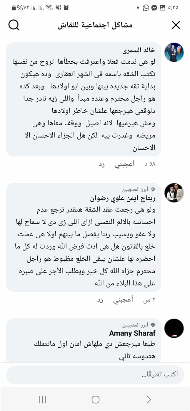 كتب أحدهم مشكلة تتعلق بصديق له على إحدى مواقع التواصل الاجتماعي "فيسبوك" والتي أوضح من خلالها أنه مغترب من أجل العمل لتحسين مستوى المعيشة خاصة وأنه متزوج ولديه ثلاثة أبناء وأضاف بأنه كان يسكن في منزل ملكًا له لتطلب منه الزوجة بيعه وشراء آخر أكبر منه ليفعل الزوج ما طلبته منه زوجته على أن تكتب الشقة بإسمه.