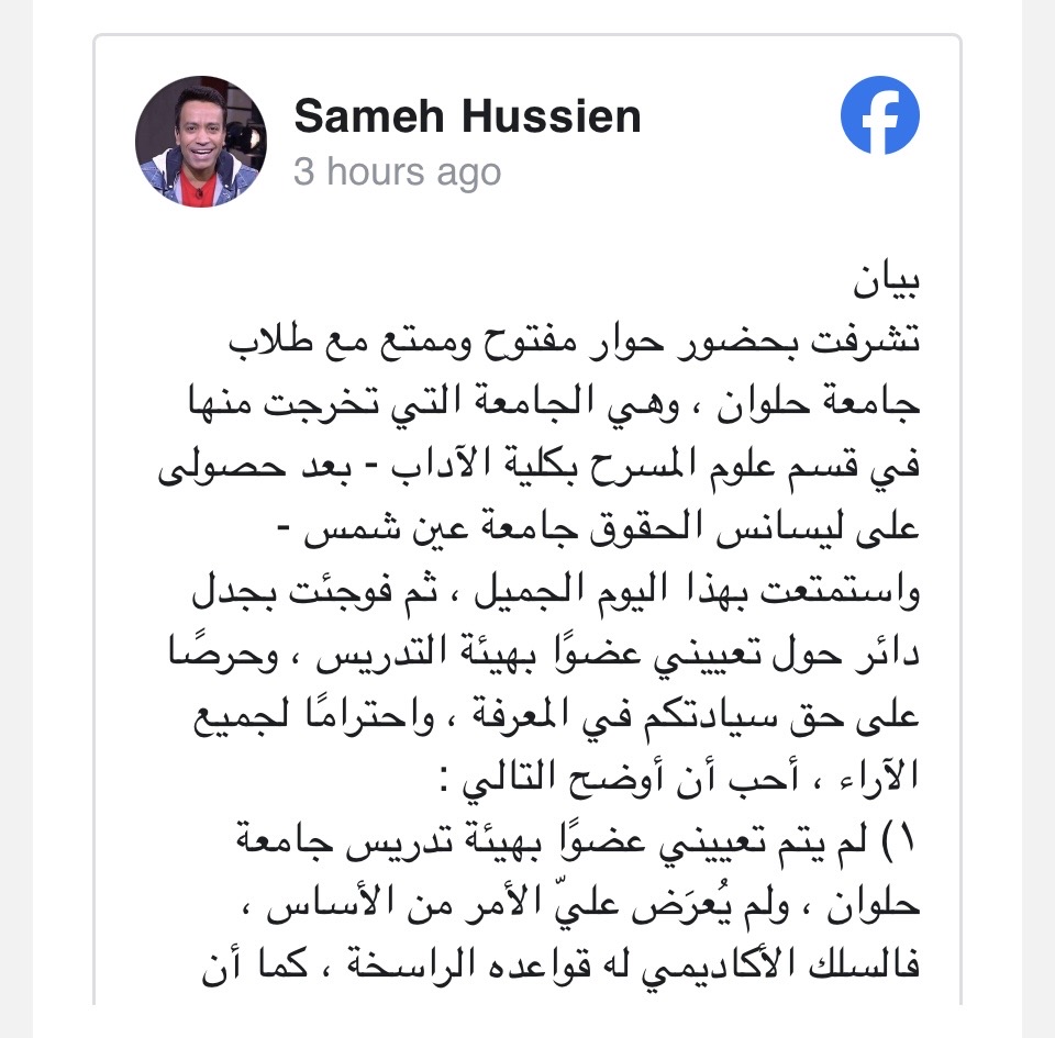 بعد الجدل الذي أثير على مواقع التواصل الاجتماعي بشأن تعيين سامح حسين عضوًا في هيئة التدريس بجامعة حلوان، خرج الفنان عن صمته كاشفًا الحقيقة الكاملة، وذلك من خلال بيان رسمي نشره عبر حساباته على مواقع التواصل الاجتماعي.