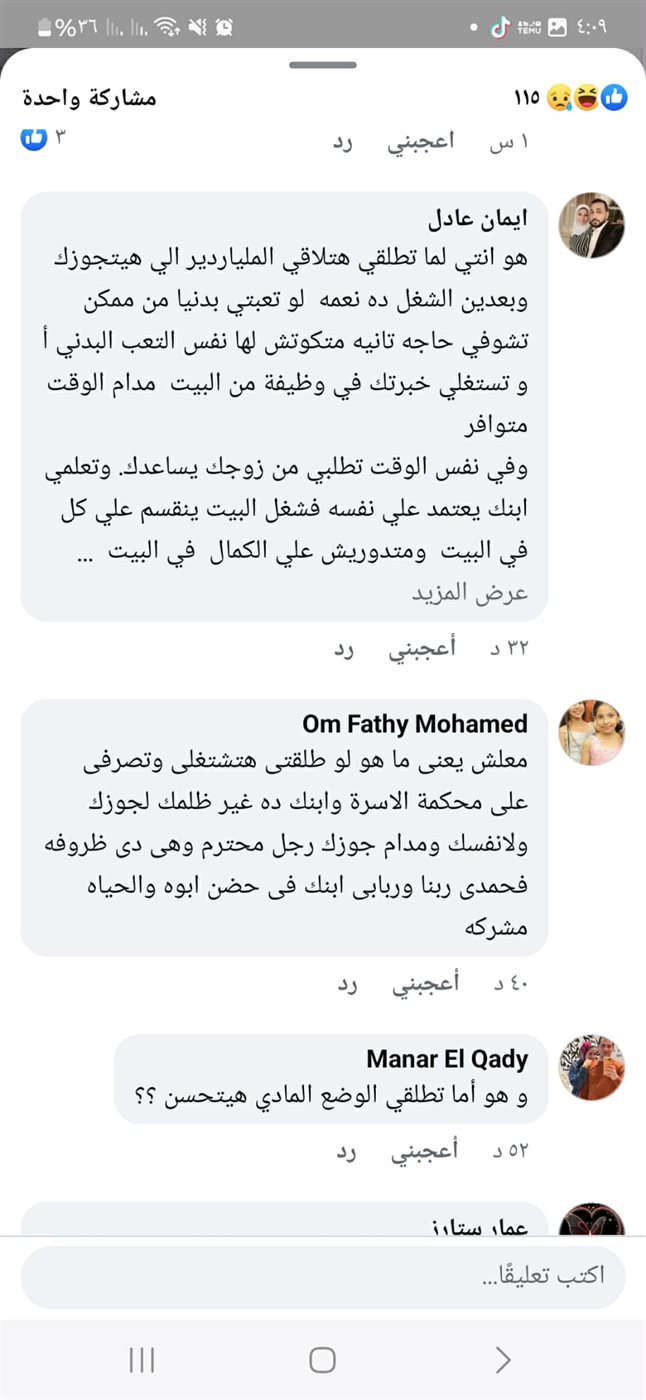 علقت "ف.إ" بأن صاحبة المشكلة بعد الطلاق قد يرزقها الله بأخر معه المال ولكن قد تكون معاملته معها كلها إهانة، وطلبت منها أن تقف بجوار زوجها فالحياة صعبة على زوجها وعلى الجميع.