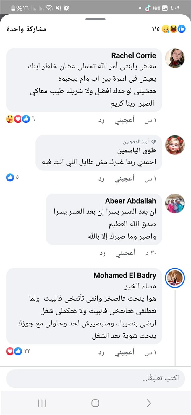 أكدت "ب.ر" على أن الزوجة الأصيلة هي التي تتحمل جميع ظروف زوجها، لتستنكر قول الزوجة بأن جميع النساء مرتاحة لتسألها من أخبركِ بذلك؟، وتستكمل بأن الطلاق ليس هو الحل فالجميع في مشقة ولا يوجد من هو مرتاح، لتدعو لها ولزوجها بسعة الرزق.