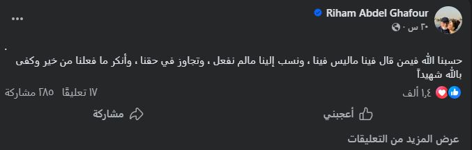 وكتبت ريهام عبد الغفور في منشورها: “كفى الله من قال فينا ما ليس فينا، ونسب إلينا ما لم نفعل، وتجاوز علينا، وجحد ما عملنا من خير، وكفى بالله شهيداً”.