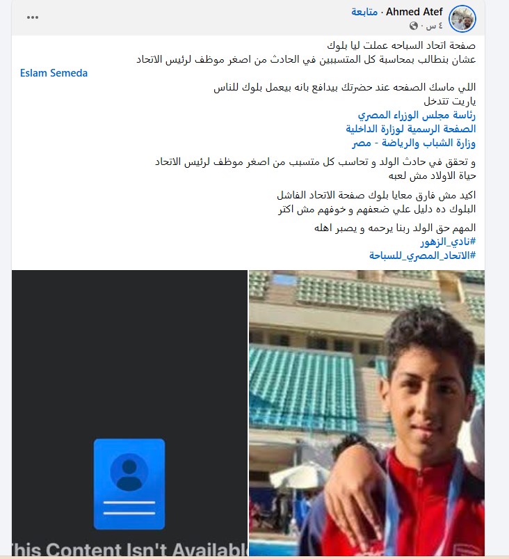 غضب بعد حظر التعليقات على صفحة اتحاد السباحة… ووفاة يوسف تشعل الاتهامات بالإهمال