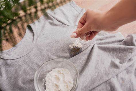 أحرصي على مسح البقعة فوراً باستخدام منشفة ورقية نظيفة أو قطعة قماش لامتصاص أكبر قدر ممكن من الزيت مع تجنب فرك البقعة بقوة حتى لا تنتشر، بعد ذلك قومي برش كمية وفيرة من مادة ماصة مثل صودا الخبز، أو النشا، أو الملح، أو بودرة الأطفال مباشرة على البقعة.