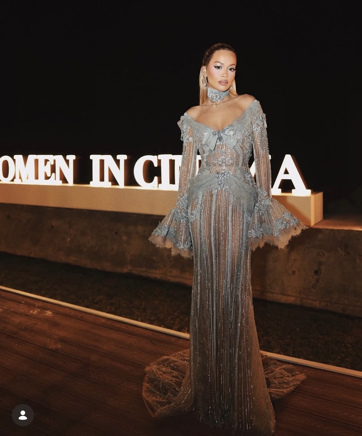 كما اختارت الجميلة كارا بونو فستان عبارة عن توب ضيقة بقصة صدر جريئة ومزدانة بكشاكش عند الأكتاف والتنورة مبطنة ومغلفة بالتول المطرز بالخيوط الذهبية وملامسة للأرض، وعن شعرها فاكتفت بتسريحة شعر منسدلة ومكياج للعيون دخاني، أما عن الإكسسوارات فعمدت إلى إرتداء أقراط مطعمة بحجر الأونيكس الأسود.