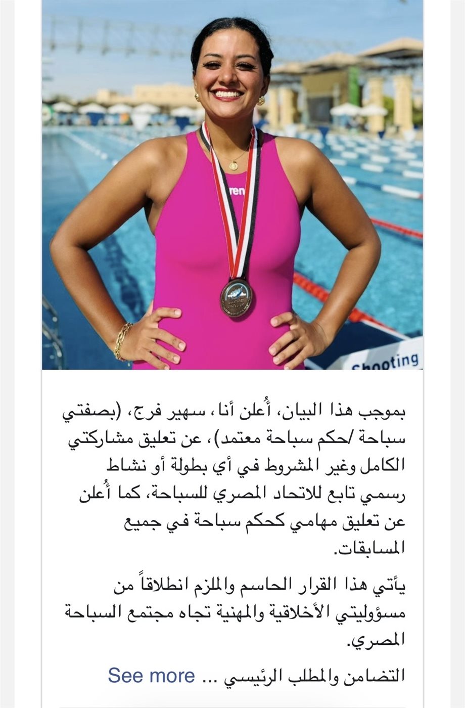 واختتمت سهير بيانها بالتأكيد على أن تعليق المشاركة والتحكيم في هذه المرحلة يمثل وقفة احتجاجية ضرورية تهدف إلى تعزيز الشفافية وضمان بيئة آمنة وعادلة في رياضة السباحة. وأضافت أنها تتحمل كامل المسؤولية عن قرارها، مشيرة إلى أن المشاركة ستعود فقط عندما يعود الحق لأهله، أما حتى ذلك الحين، فالتعليق سارٍ ونافذ.