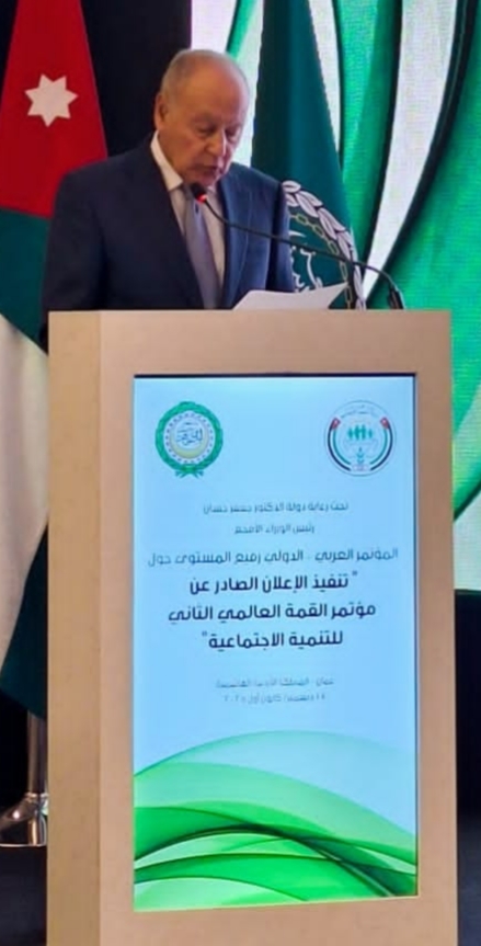 جاء ذلك في كلمته خلال افتتاح أعمال المؤتمر العربي رفيع المستوى حول تنفيذ الإعلان الصادر عن مؤتمر القمة العالمي الثاني للتنمية الاجتماعية، والذي عُقد في المملكة الأردنية الهاشمية، في 17 ديسمبر 2025، بمشاركة عربية ودولية واسعة.