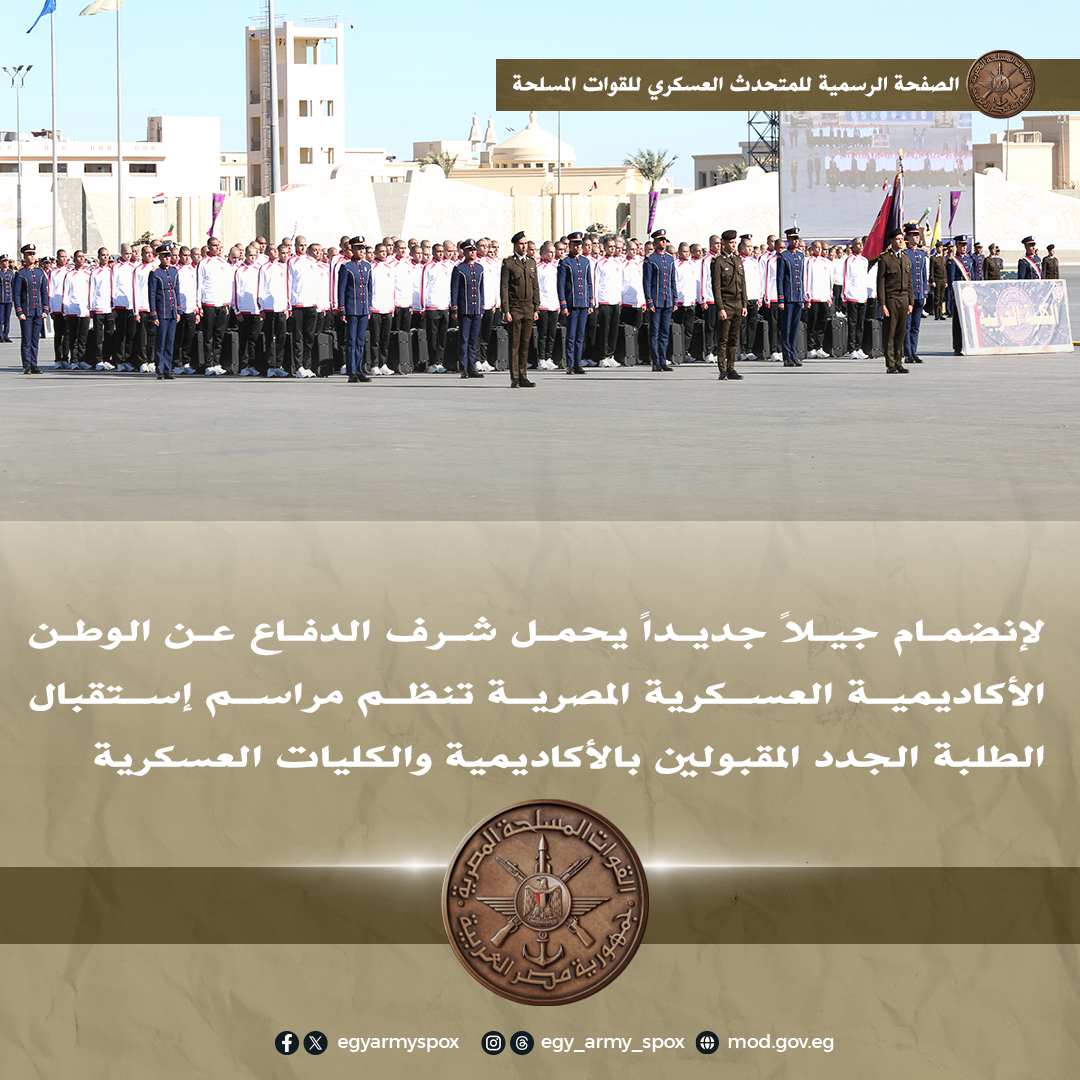 نظمت الأكاديمية العسكرية المصرية بمقرها الحالى بالكيان العسكرى مراسم إستقبال الطلبة الجدد المقبولين لهذا العام من الدفعة ( 122 ) حربية وما يعادلها من الكليات العسكرية ، لتعلن إنضمام جيلاً جديداً يحمل شرف ومسئولية الدفاع عن الوطن .