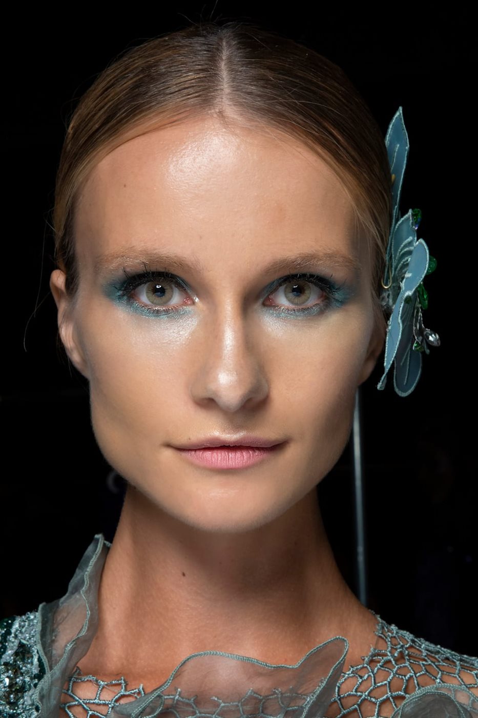 الفستان التركواز أو الأزرق يحمل روحاً منعشة ولمسة جريئة تنبض بالحيوية، لذلك يحتاج إلى مكياج يعكس هذا الصفاء دون أن يفقد أناقته. البداية تكون مع بشرة مضيئة ونقية بلمسة ساتانية خفيفة، تبرز ملامح الوجه وتمنحها إشراقاً صحياً ينسجم مع برودة اللون. العيون يمكن أن تتألق بظلال مائية ناعمة مثل الأزرق الفاتح، التركواز الخافت، أو لمسة فضية باردة، مع دمج سلس، يمنح العينين عمقاً جذاباً دون مبالغة.