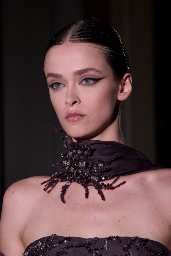 أما الخدود، فدرجات الوردي البارد أو الموف الخفيف تُكمل روح الفستان، وتمنح الملامح نعومة أنثوية راقية. وتأتي الشفاه بدرجات النيود الوردي أو الوردي الشفاف؛ لتحافظ على توازن المكياج وتترك المجال للون الفستان أن يتصدر المشهد. هكذا يظهر المكياج متناغماً مع الفستان البنفسجي، أنيقاً، هادئاً، ومليئاً بالجاذبية الراقية لليلة رأس السنة 2026.