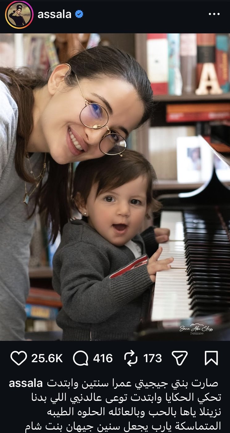 حيث قالت فيها: “صارت بنتي جيجيتي عمر سنتين وابتدت تحكي الحكايا وابتدت توعى عالدنيي اللي بدنا نزينلا ياها بالحب وبالعائله الحلوه الطيبه المتماسكة.”