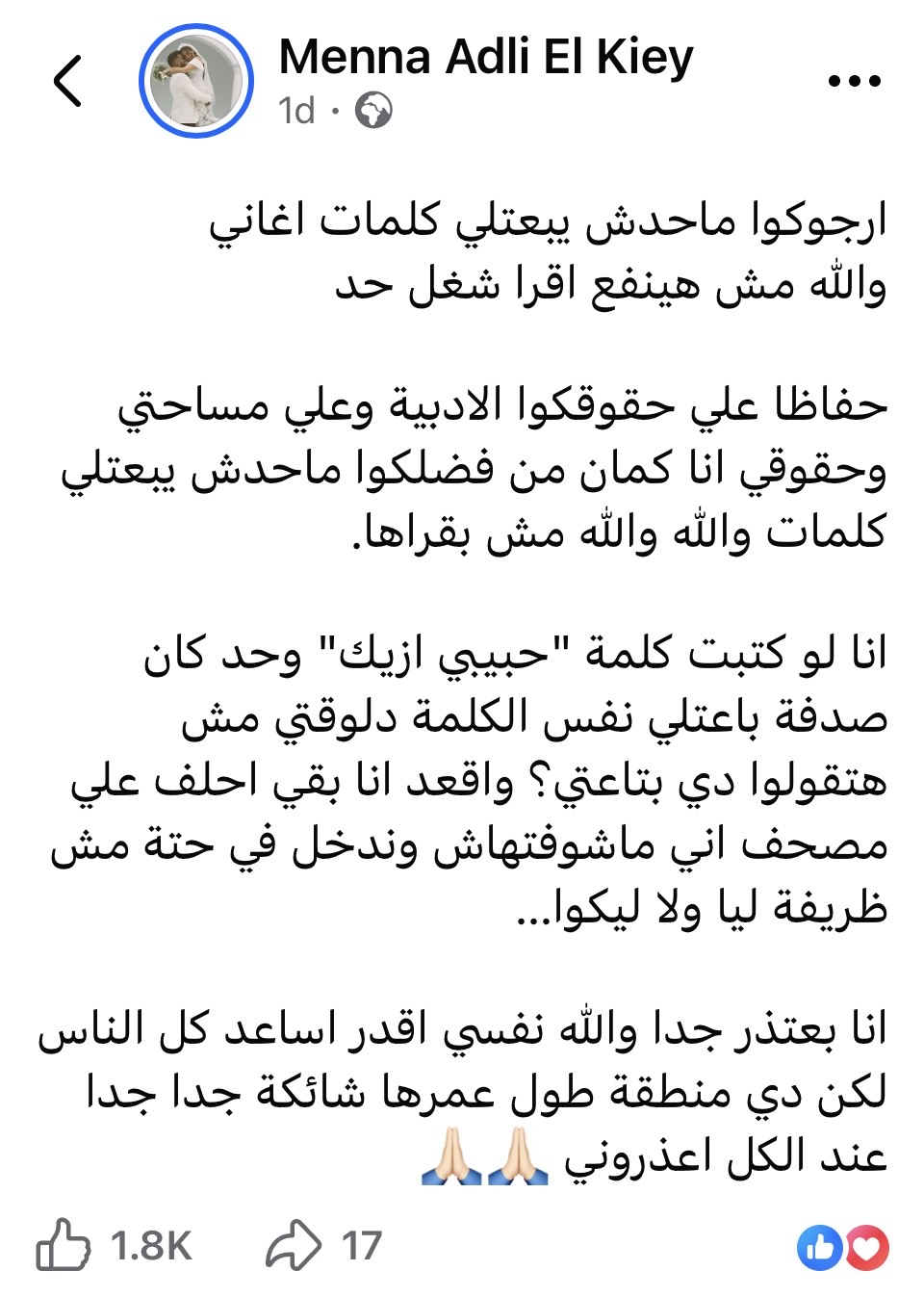 وفي رسالة صريحة لمتابعيها عبر حسابها الرسمي على موقع فيسبوك، شددت منة عدلي القيعي على ضرورة التوقف عن إرسال أي نصوص غنائية خاصة، قائلة: “أرجوكوا ما حدش يبعتلي كلمات أغاني”.