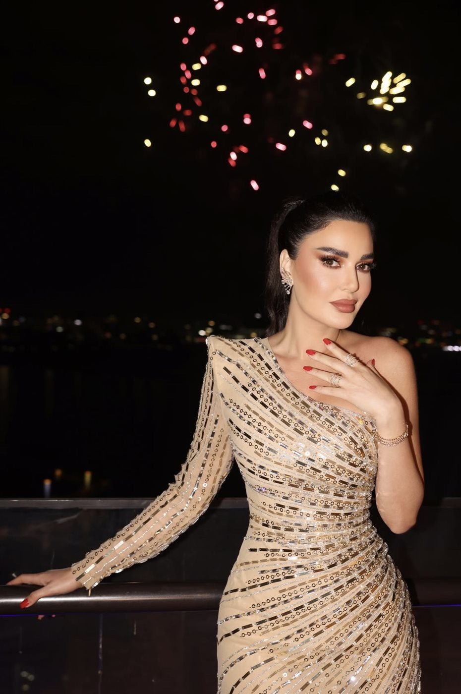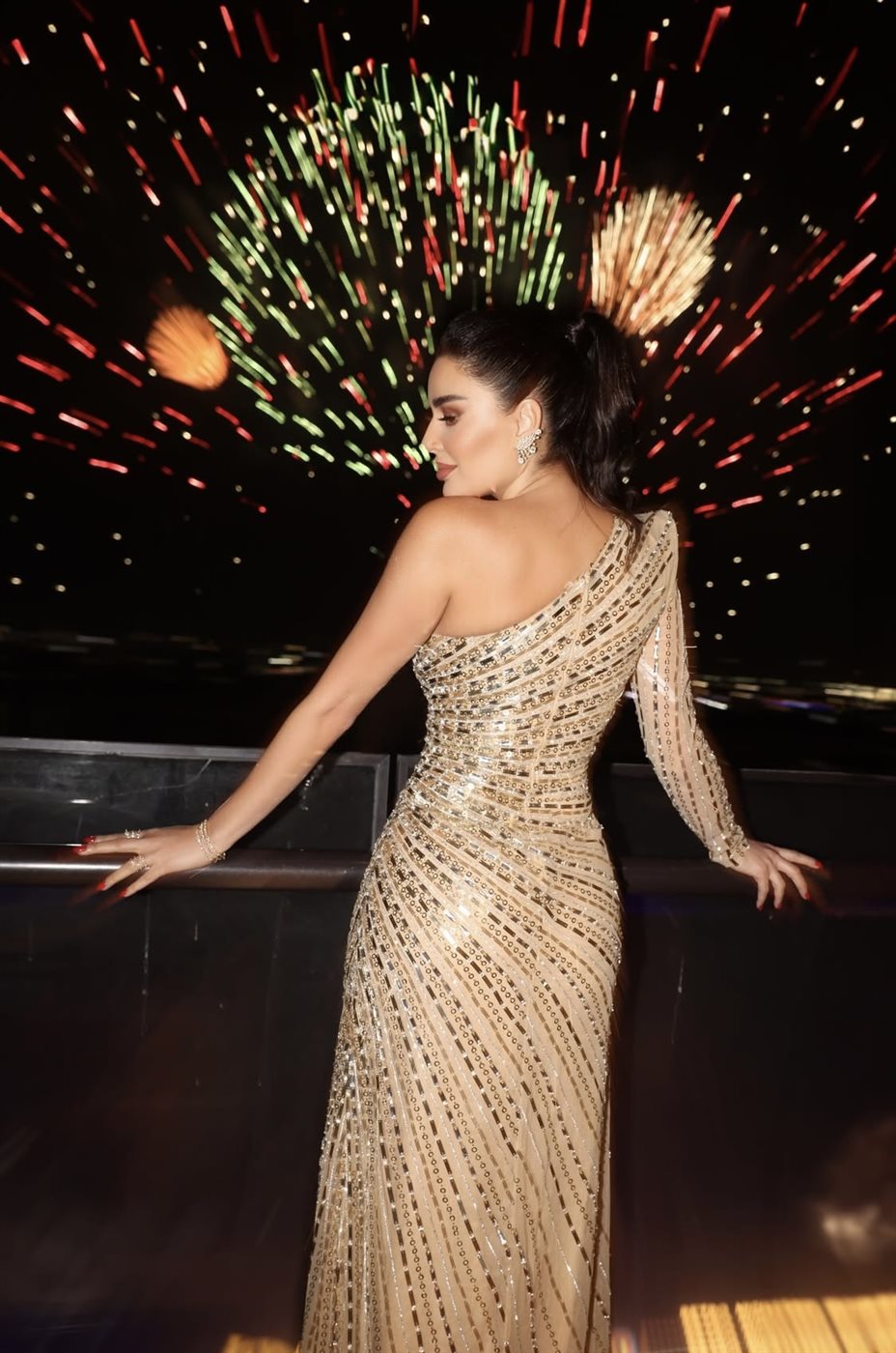 وفي التفاصيل، اختارت سيرين عبد النور فستانًا ذهبيًا لامعًا بتصميم أنثوي راقٍ من توقيع طوني ورد، جاء بقصة الكتف الواحد مع كم طويل منسدل، ما منح الإطلالة توازنًا متناغمًا بين الجرأة والرقي. وانسدل الفستان بانسيابية على القوام، مزدانًا بتطريزات وخطوط براقة عكست الضوء بنعومة، لتتناغم مع بريق الألعاب النارية في الخلفية.