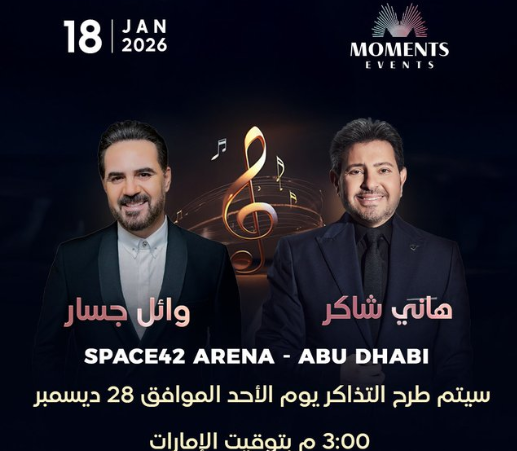 وبالتوازي مع هذه التصريحات، يستعد جمهور الطرب العربي الأصيل لموعد فني مميز، حيث يلتقي هاني شاكر ووائل جسار في أمسية غنائية استثنائية على مسرح Space42 Arena في أبوظبي، وذلك يوم الأحد 18 يناير 2026.