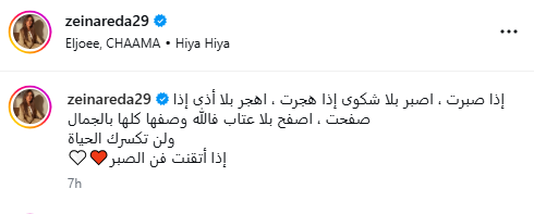وكتبت زينة قائلة: “إذا صبرت، اصبر بلا شكوى… وإذا هجرت، اهجر بلا أذى… وإذا صفحت، اصفح بلا عتاب… فالله وصفها كلها بالجمال، ولن تكسرك الحياة إذا أتقنت فن الصبر.”