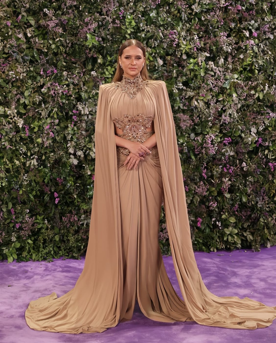 وزادت العباءة المرفقة بالفستان من فخامة الإطلالة، إذ انسدلت بخفة خلف النجمة، مانحة حضورها بعدًا دراميًا أنيقًا وإحساسًا ملكيًا لافتًا أمام عدسات المصورين. هذا التفصيل أضفى حركة وانسيابية على الإطلالة، وجعلها أكثر تأثيرًا على السجادة البنفسجية.