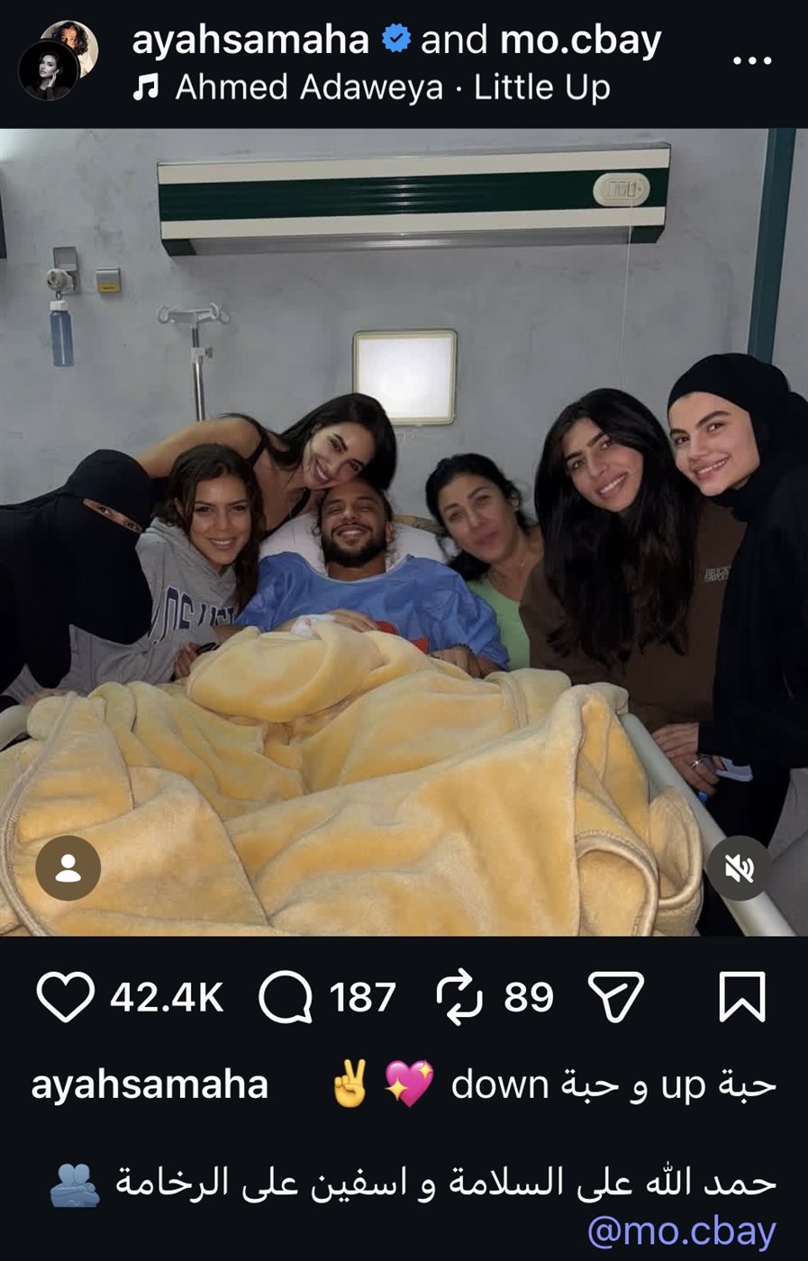 وشاركت آية سماحة صورة جمعتها بزوجها وعدد من الأقارب من داخل المستشفى، ظهر خلالها محمد السباعي على سرير المرض، وذلك عبر حسابها الرسمي على موقع الصور والفيديوهات الشهير «إنستجرام». ورغم عدم كشفها عن تفاصيل الحالة الصحية أو أسباب دخوله المستشفى، حرصت الفنانة على طمأنة الجمهور، وعلّقت على الصورة قائلة: “حبة up وحبة down.. الحمد لله على السلامة، آسفين على الرخامة”، في رسالة حملت طابعًا إنسانيًا خفيفًا عكس روح التفاؤل والدعم.