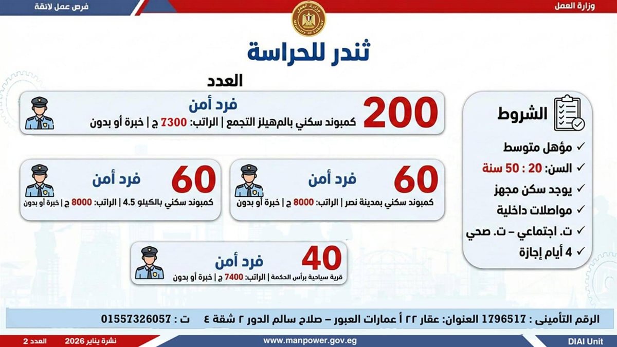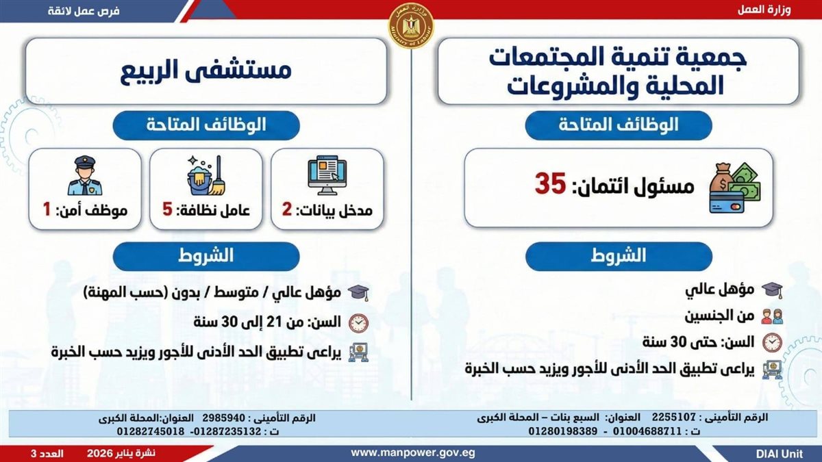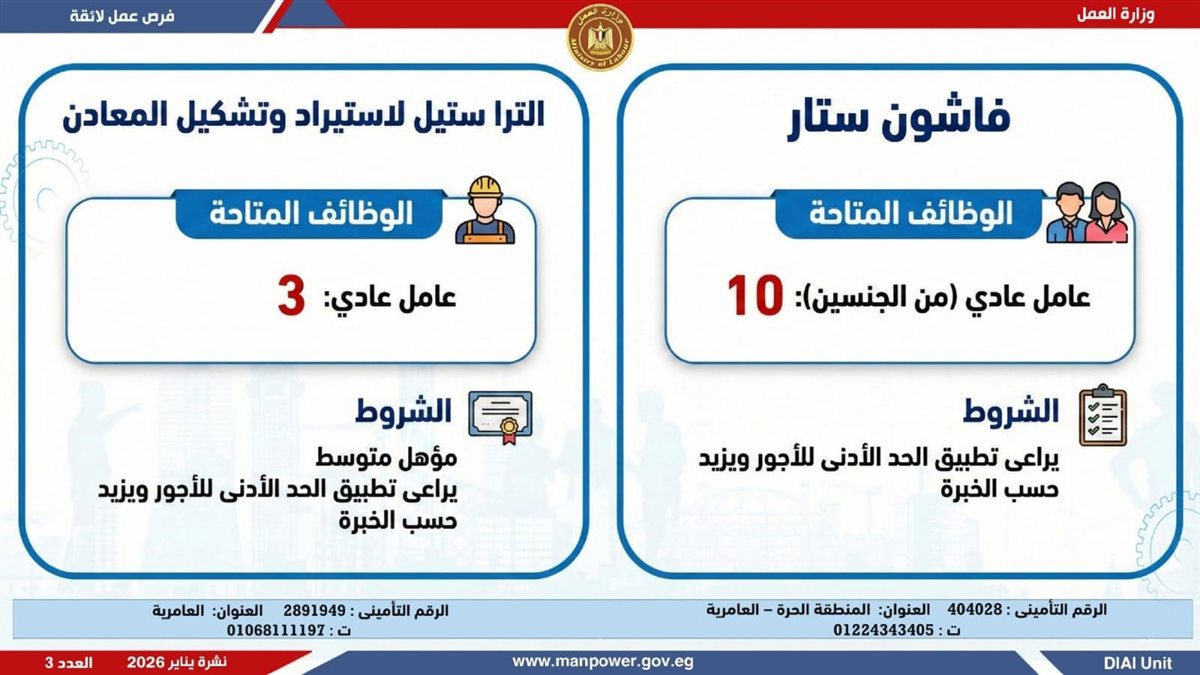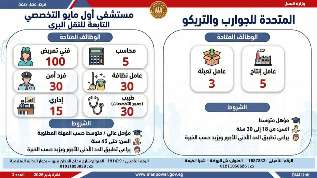 وأوضحت وزارة العمل، في بيان لها ، أن الفرص المتاحة تشمل وظائف متنوعة في عدد من التخصصات والمهن، من بينها فرص مخصصة لذوي الهمم، برواتب مجزية تُحدد وفقًا لطبيعة الوظيفة والمقابلة الشخصية، مع الالتزام الكامل بتطبيق الحد الأدنى للأجور، إلى جانب الاستفادة من مظلة التأمينات الاجتماعية والصحية.