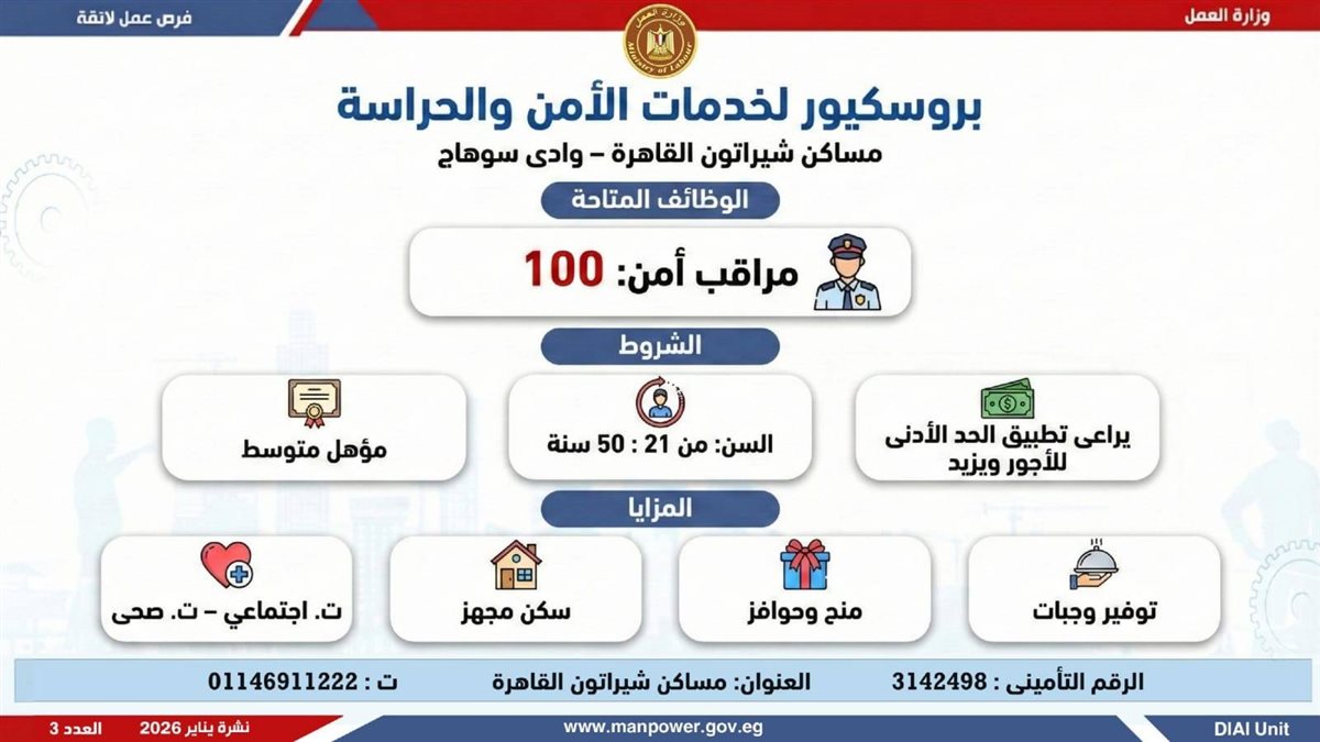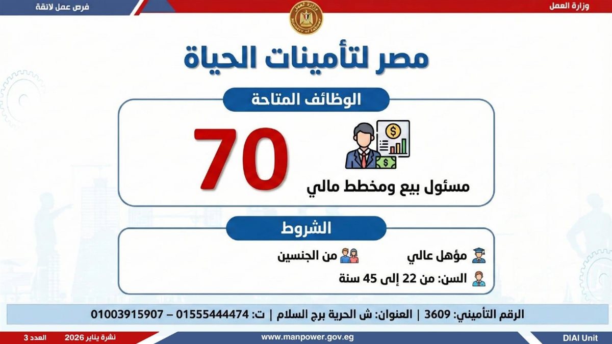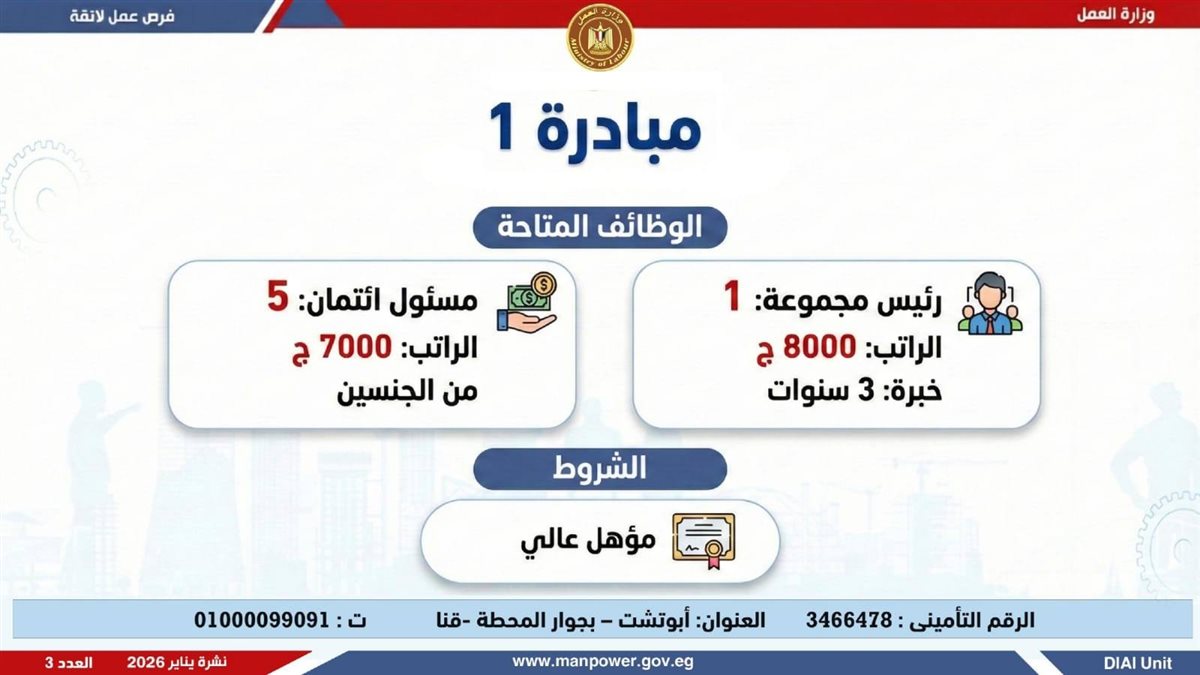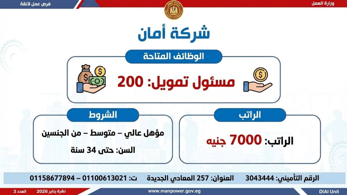 وأوضحت وزارة العمل، في بيان لها ، أن الفرص المتاحة تشمل وظائف متنوعة في عدد من التخصصات والمهن، من بينها فرص مخصصة لذوي الهمم، برواتب مجزية تُحدد وفقًا لطبيعة الوظيفة والمقابلة الشخصية، مع الالتزام الكامل بتطبيق الحد الأدنى للأجور، إلى جانب الاستفادة من مظلة التأمينات الاجتماعية والصحية.