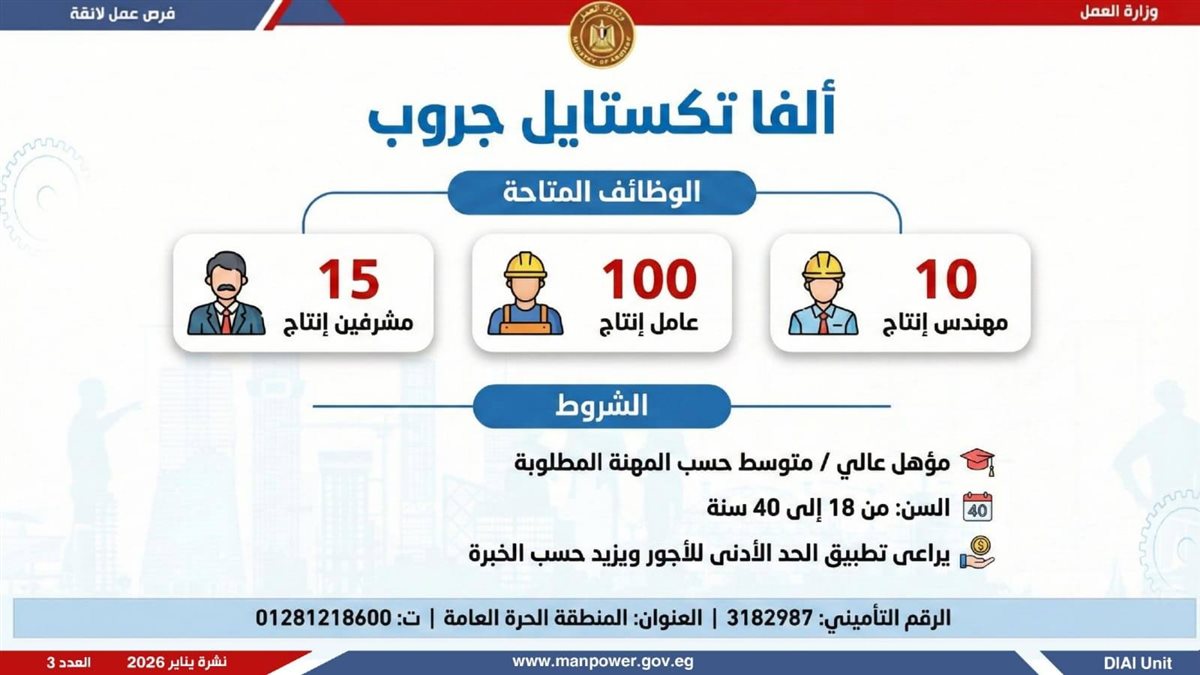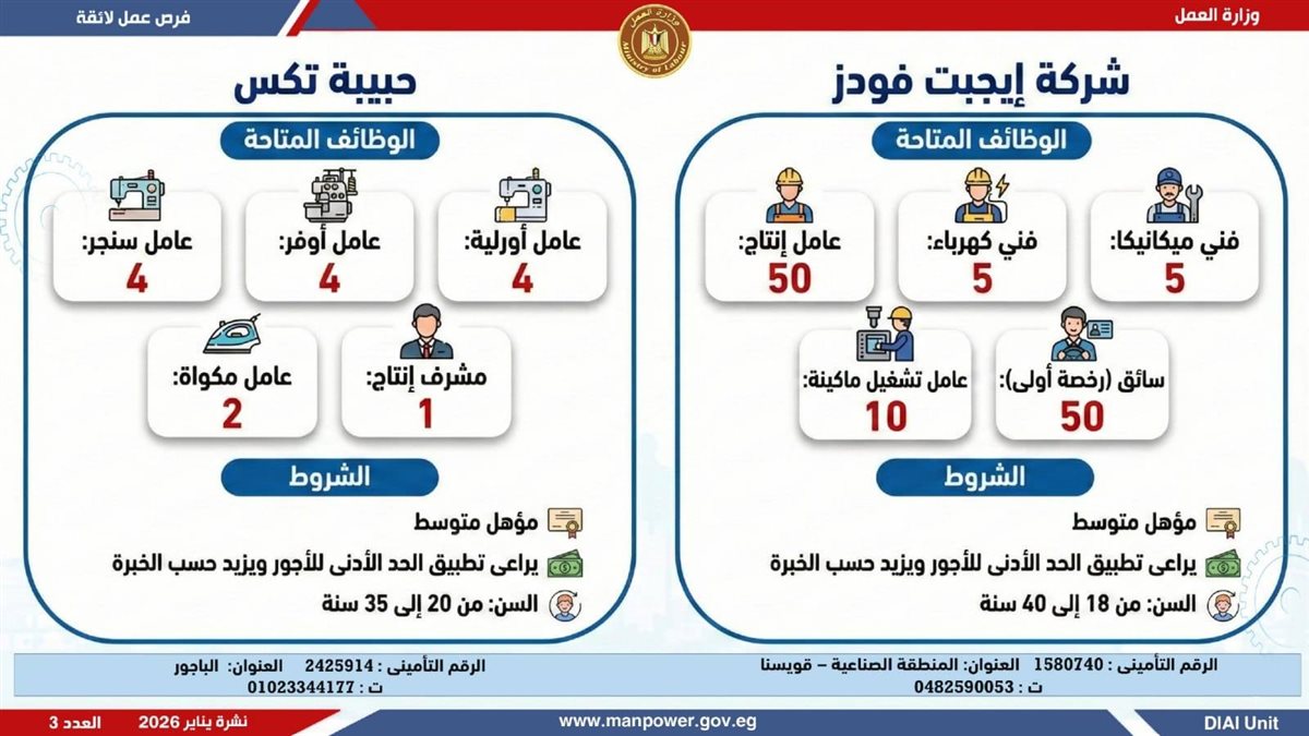 في إطار التزام الدولة بمواجهة البطالة، ودعم جهود التشغيل، وتعزيز الشراكة مع القطاع الخاص، أعلن وزير العمل محمد جبران، اليوم الثلاثاء، عن إصدار نشرة التوظيف نصف الشهرية، والتي تتضمن توفير 4379 فرصة عمل جديدة بالتعاون مع 37 شركة من شركات القطاع الخاص، موزعة على 12 محافظة، مع إتاحة التقديم خلال شهر فبراير 2026.