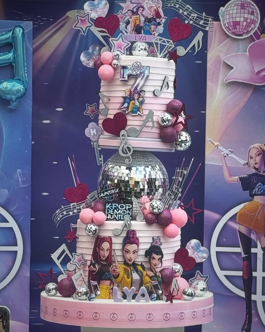 وبدا واضحًا أن ليا تحمل شغفًا خاصًا بعالم الأنيميشن، إذ جاء تصميم قالب الحلوى مستوحى من فيلم K-pop Demon Hunters الشهير، الذي عُرض عام 2025، حيث زُينت التورتة بشخصيات فتيات البوب وصائدات الشياطين، في لمسة تعكس ذوقها الطفولي وحبها للمغامرة.