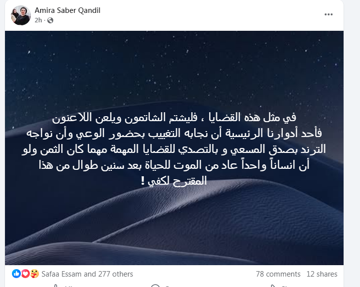 وكتبت النائبة عبر صفحتها على مواقع التواصل الاجتماعي: «في مثل هذه القضايا، فليشتم الشاتمون ويلعن اللاعنون، فأحد أدوارنا الرئيسية أن نجابه التغييب بحضور الوعي»، مضيفة: «أن نواجه الترند بصدق المسعى وبالتصدي للقضايا المهمة مهما كان الثمن، ولو أن إنسانًا واحدًا عاد من الموت للحياة بعد سنوات طويلة بسبب هذا المقترح لكفى».