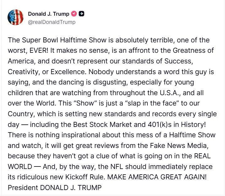 وربط ترامب انتقاداته الفنية بما وصفه بإنجازات إدارته، مشيرًا إلى تحقيق أرقام قياسية في سوق الأسهم، معتبرًا أن عرض باد باني «صفعة في وجه تلك النجاحات»، قبل أن يوسّع هجومه ليشمل دوري كرة القدم الأمريكية (NFL)، مجددًا اعتراضه على «قانون ضربة البداية الجديد» الذي طُبق عام 2024 وعدّل في 2025 للحد من الإصابات، وهو قانون سبق أن أعلن معارضته له أكثر من مرة.