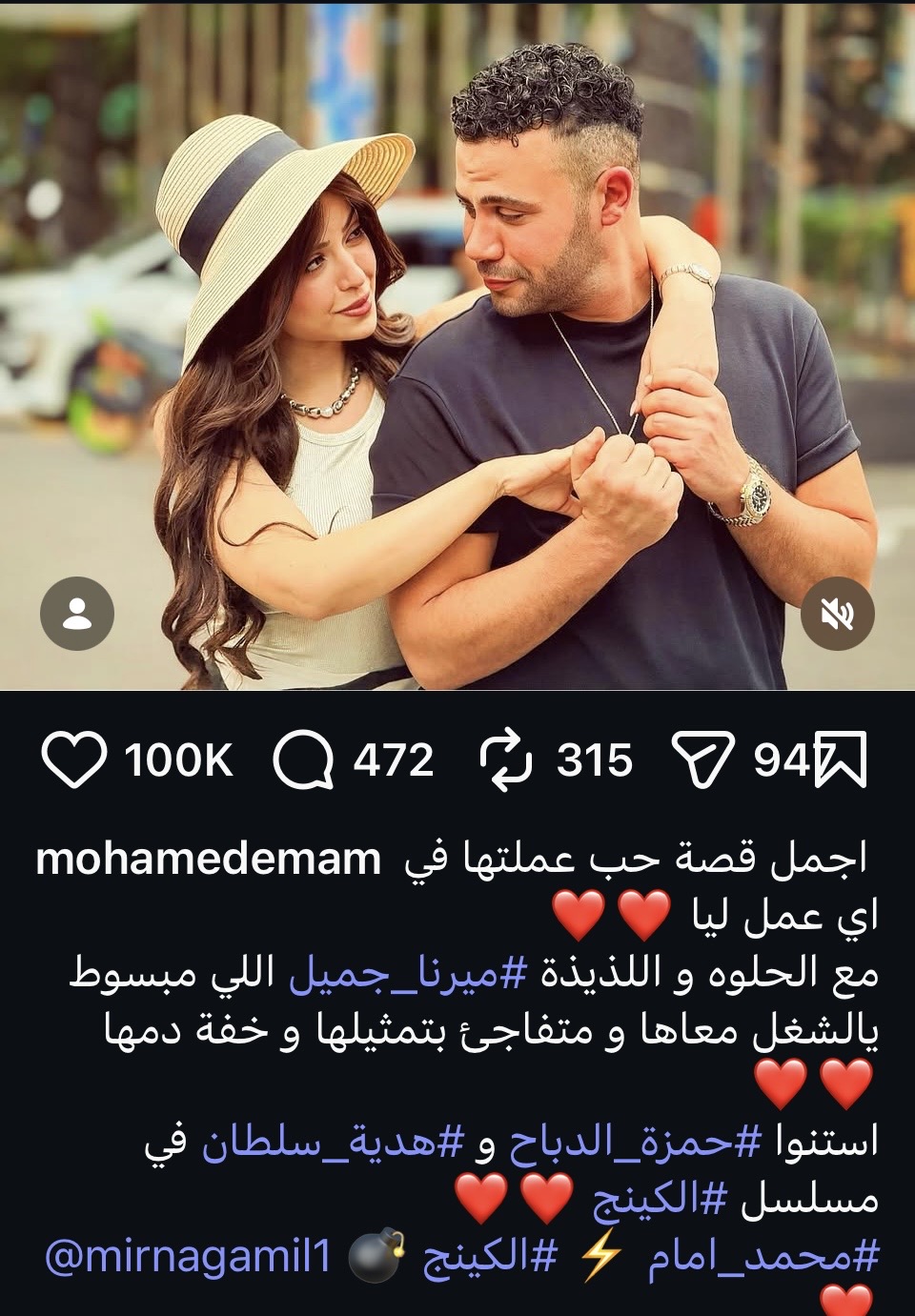 وفي إطار الترويج للعمل، شارك محمد إمام متابعيه عبر حسابه الرسمي على إنستجرام صورة جمعته بالفنانة ميرنا جميل، عكست أجواء رومانسية توحي بخط حب محوري داخل أحداث المسلسل. وعلّق إمام على الصورة قائلاً: “أجمل قصة حب عملتها في أي عمل ليا مع الحلوة واللذيذة ميرنا جميل، مبسوطين جدًا بالشغل معاها ومتفاجئ بتمثيلها وخفة دمها.”
