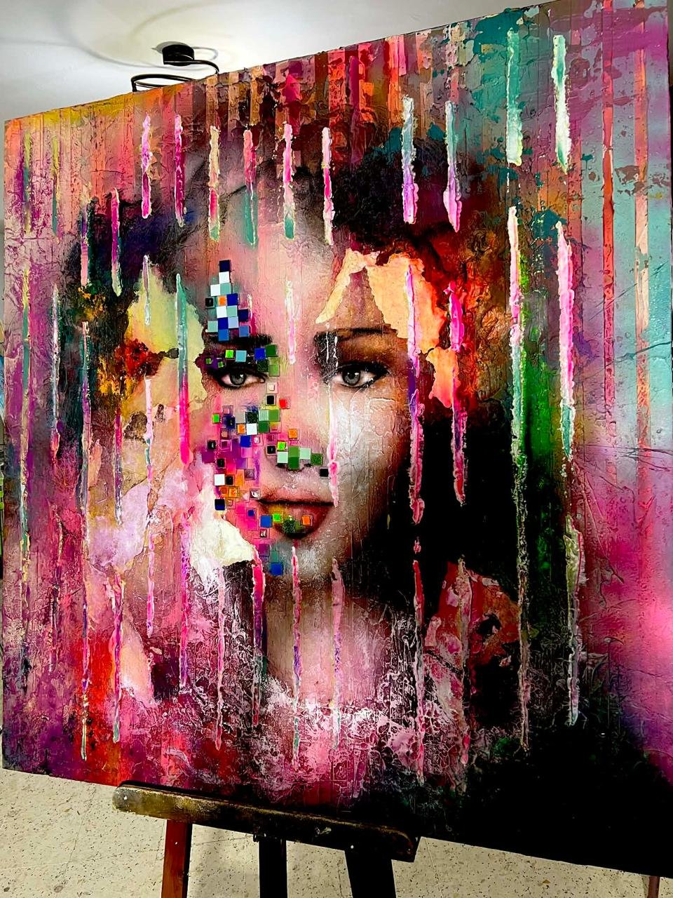 في لوحة “الجدة” (الجيل الأول)، تعتمد الفنانة على ملامس كثيفة وخطوط متشققة تحاكي أخاديد السنين، بحيث يصبح الوجه مساحةً تتراكم فيها التجربة ، أما في تمثيل الجيل المعاصر، فتبرز بنية لونية أقرب إلى الموزاييك المتداخل، في إشارة إلى تشظي المرجعيات وتعدد الانتماءات البصرية في زمن الحداثة.