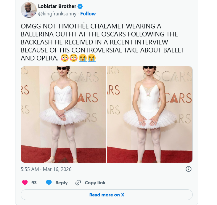 وبينما اقترب تيموثي شالاميه من المعجبين لالتقاط الصور عند وصوله إلى مسرح Dolby Theatre، انهالت التعليقات الساخرة؛ إذ شبّهه بعض المستخدمين بـ”ساعي الحليب”.