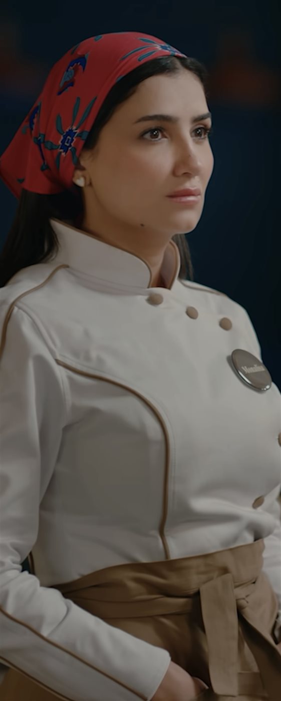 برزت إحدى أهم الإطلالات في مشهد ارتدت فيه مي عمر فستان زفاف أبيض، بتصميم ناعم وقصة كلاسيكية. جاء الفستان مزودًا بتفاصيل درابيه عند الصدر وتصميم أوف شولدر، ما أضفى على المظهر لمسة من الرقي والبساطة، متماشيًا مع سياق العمل الدرامي وإبراز الأناقة الكلاسيكية للشخصية.